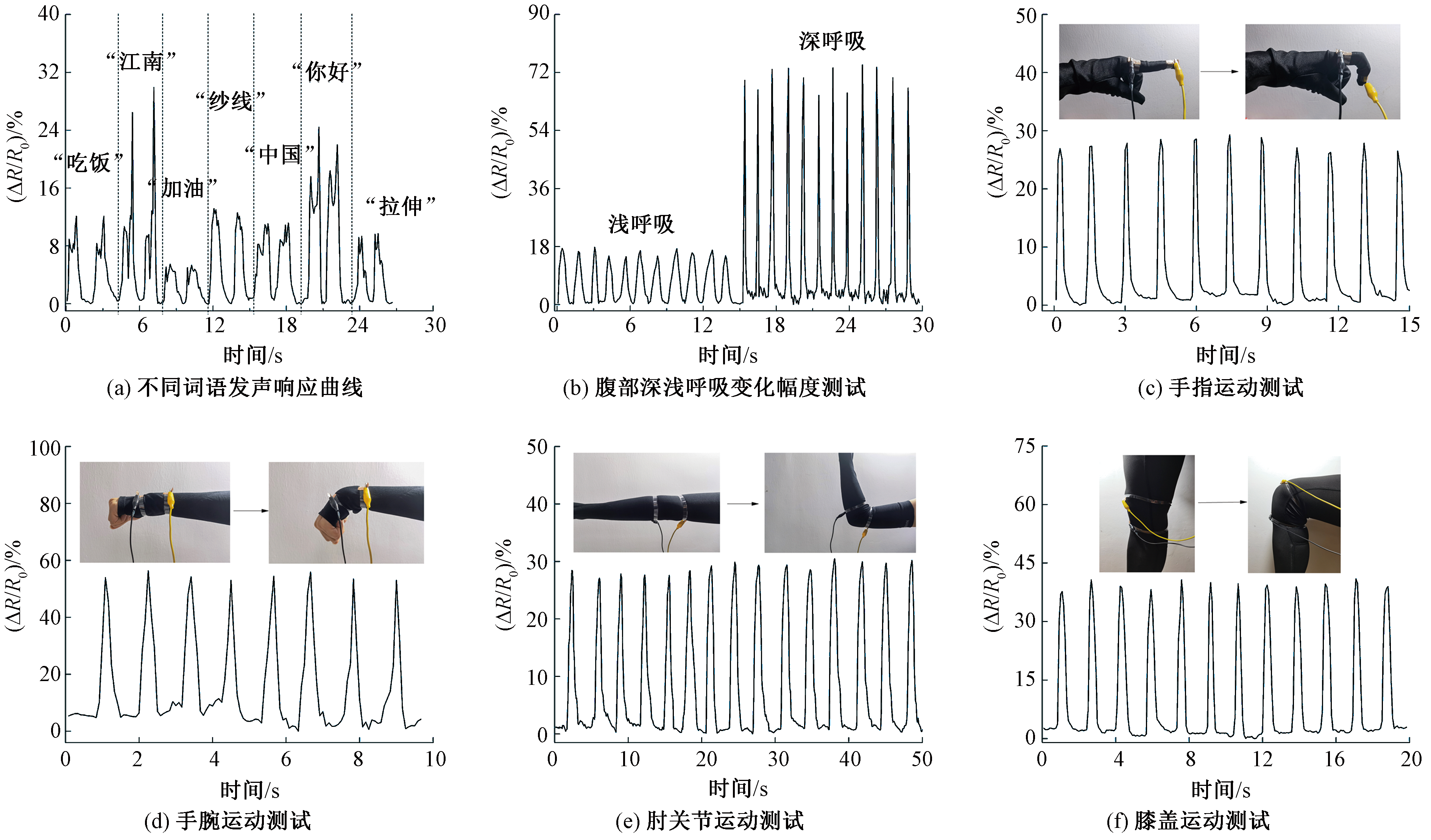 Application of yarn strain sensor in wearables. (a) Vocal response curves of different words; (b) Abdominal deep and shallow breathing range test; (c) Finger motion test; (d) Wrist motion test; (e) Elbow motion test; (f) Knee motion test"