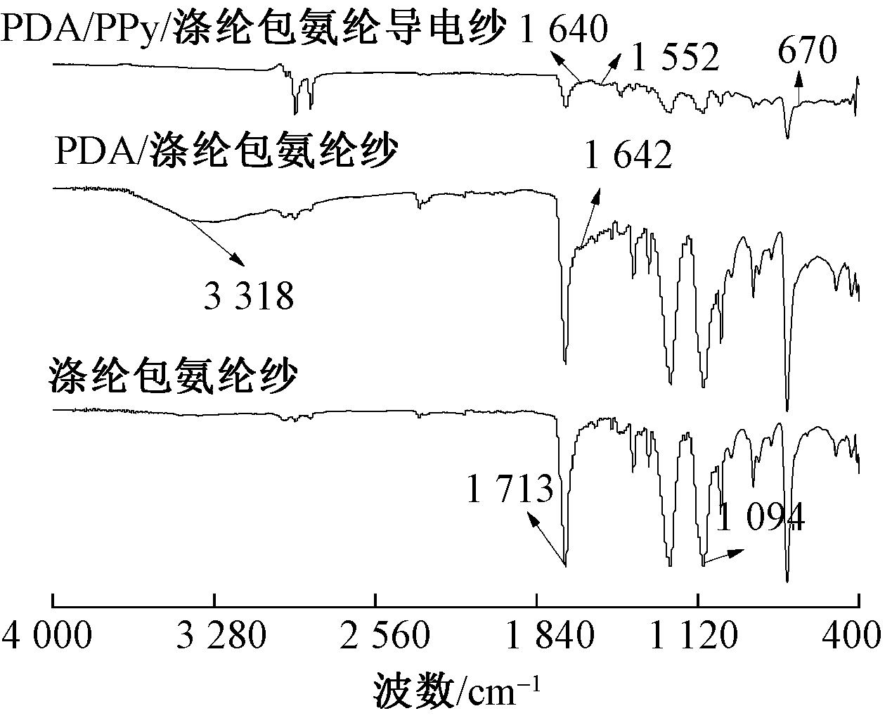 Method With polyester-coated spandex yarn as the substrate, a layer of polydopamine (PDA) was deposited on the surface of the substrate by impregnation to improve the adhesion of polypyrrole (PPy) to the substrate. Then, PPy was synthesized by in-situ freezing interface polymerization to effectively avoid unfavorable cross-linking or branching in the polymer, improve the conductivity, and obtain a flexible yarn strain sensor aiming for excellent tensile strain sensing performance. The conductive yarn's microscopic morphology and chemical structure were characterized by scanning electron microscopy, X-ray spectroscopy and Fourier transform infrared spectroscopy.