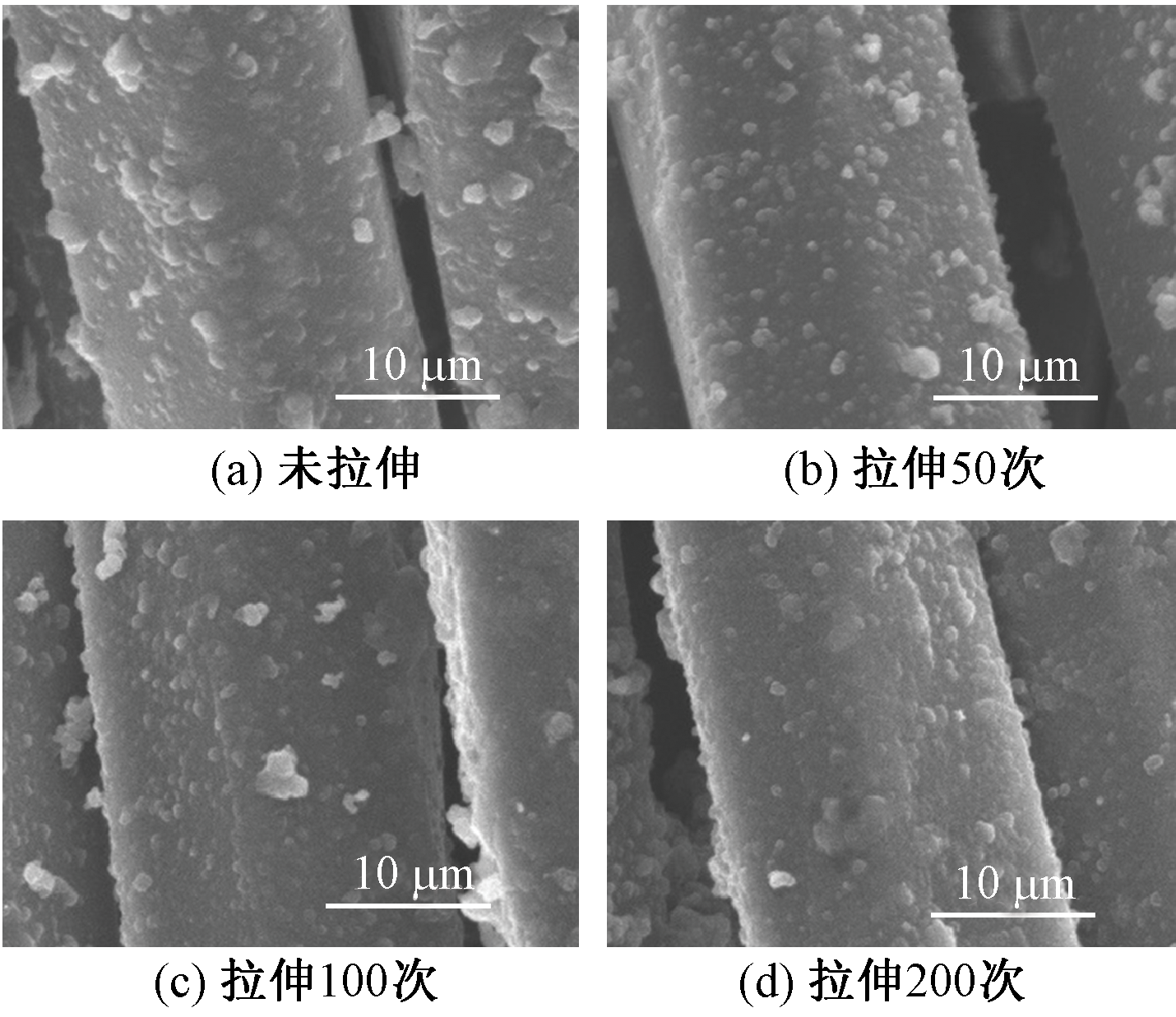 SEM images of yarn before and after streching. (a) Unstretched; (b) Stretched for 50 times; (c) Stretched for 100 times; (d) Stretched for 200 times"