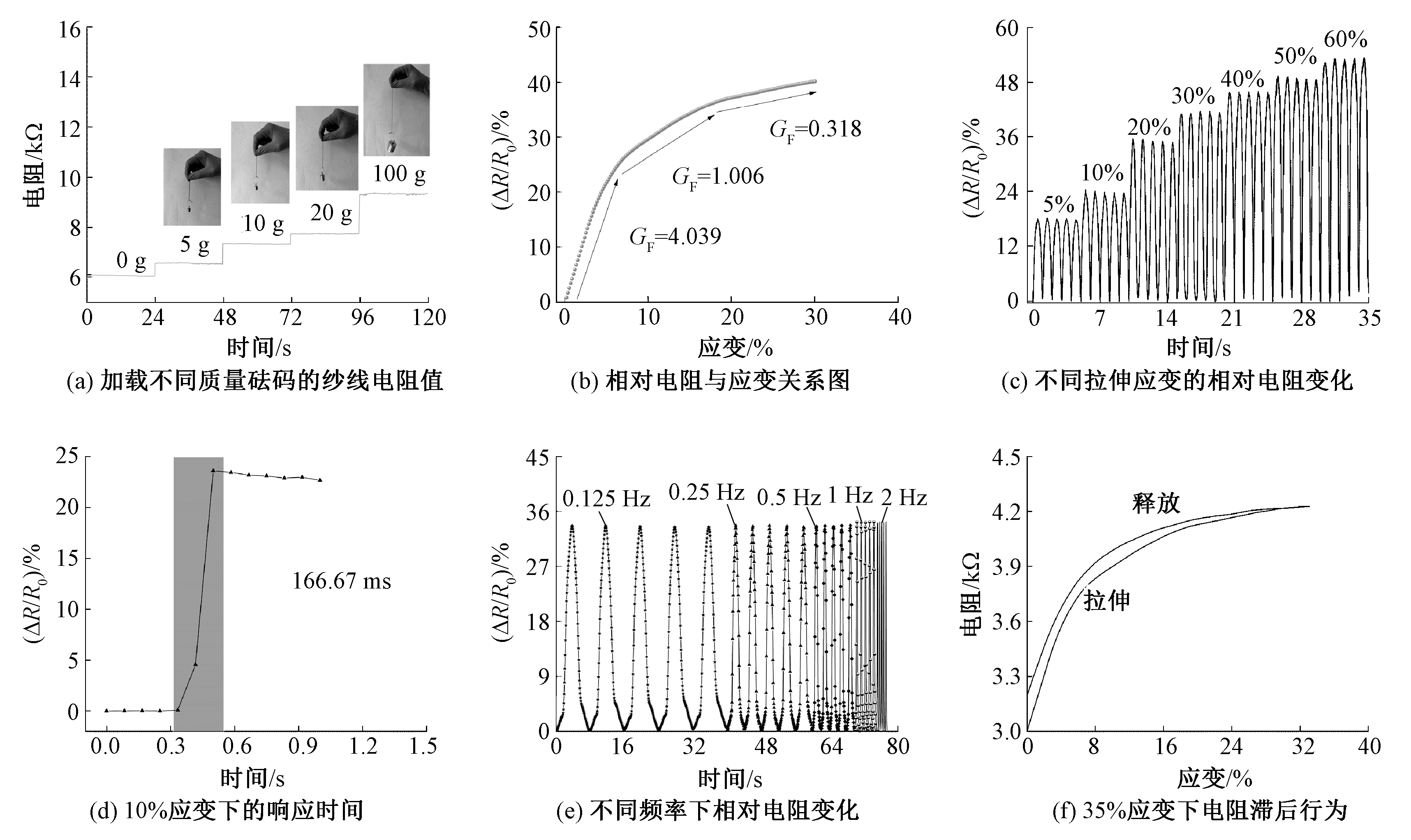 Yarn strain sensing performance test. (a) Load yarn resistance values with different mass weights; (b) Diagram of relative resistance and strain; (c) Relative resistance variation under different tensile strains; (d) Response time under 10% strain; (e) Variation of relative resistance at different frequencies; (f) Resistance hysteresis behavior at 35% strain"
