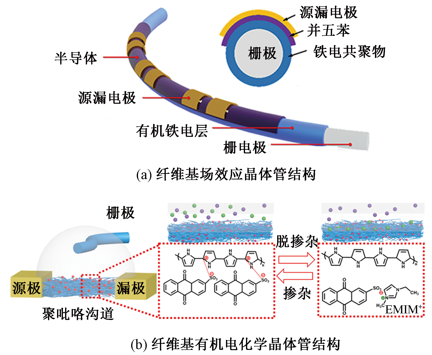 Schematic diagram of fiber-based transistors. (a) Fiber-based field-effect transistor; (b) Fiber-based organic electrochemical transistor"