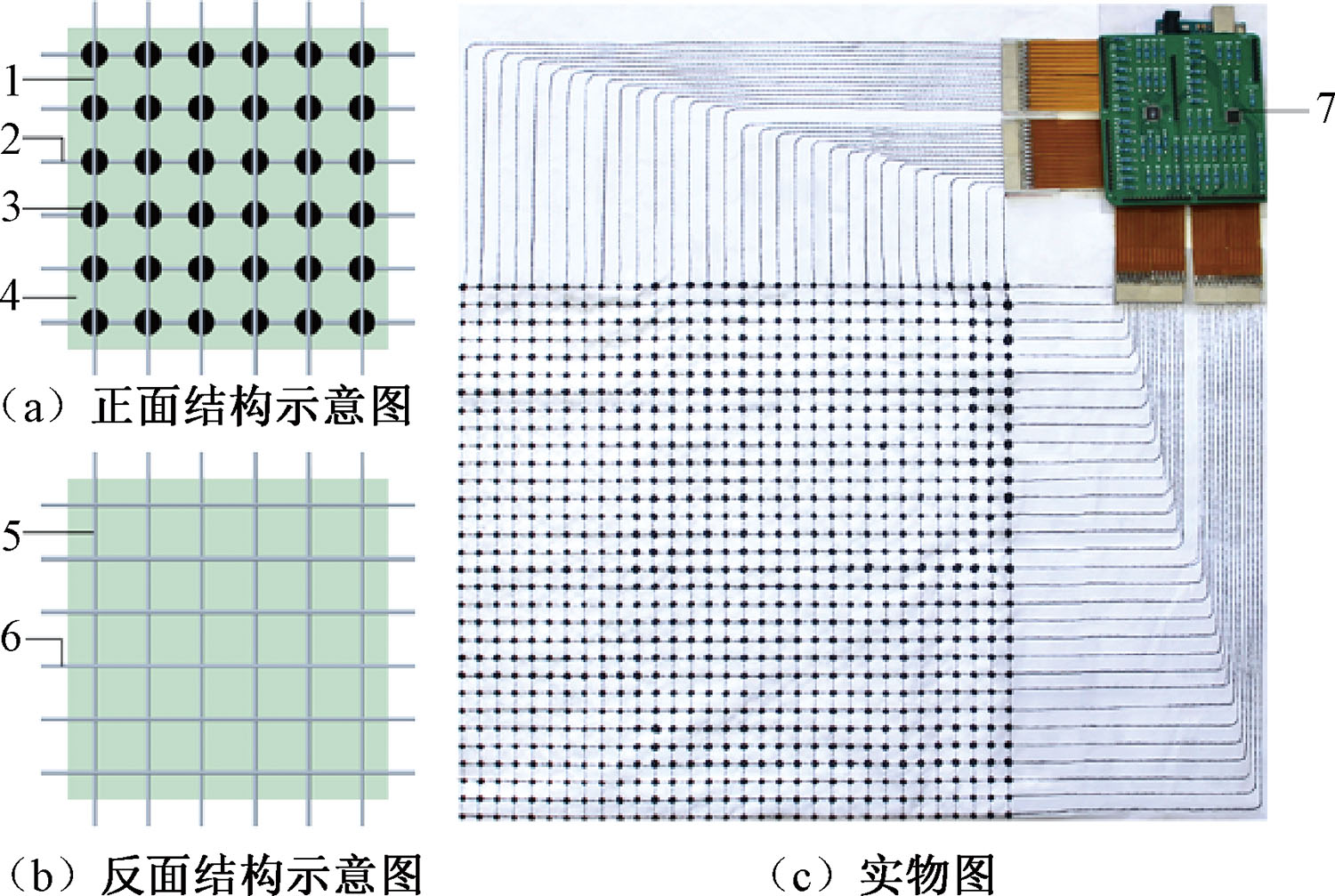 Fabric pressure sensor array system. (a) Schematic diagrams of front surface; (b) Schematic diagram of back surface; (c) Physical image"
