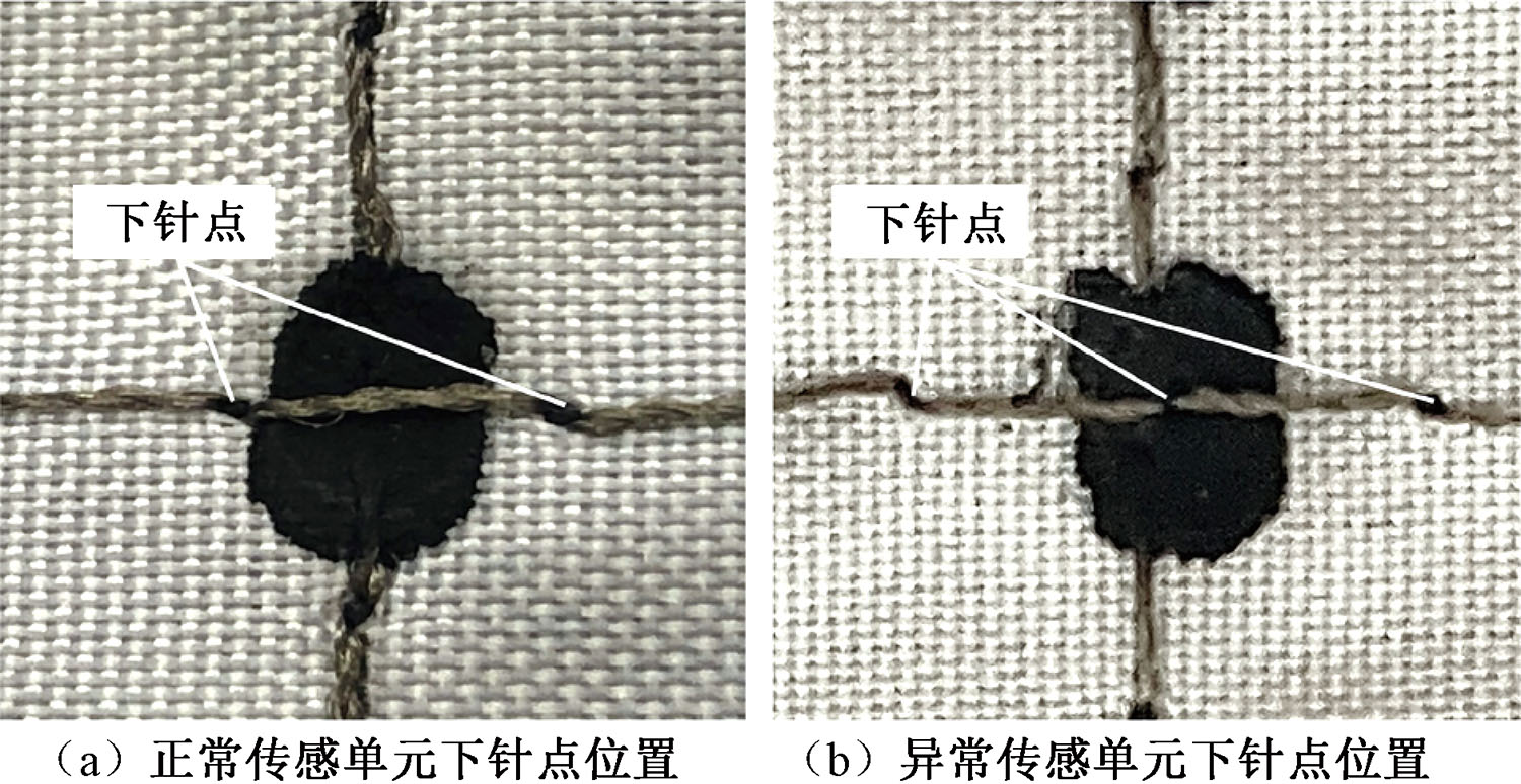 Sewing state of conductive yarn near sensor unit. (a) Needle point location for normal sensing unit; (b) Needle point location for abnormal sensor unit"