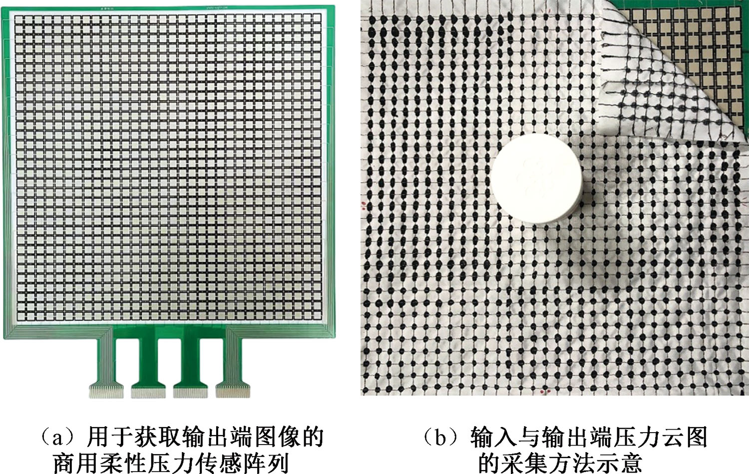 Collection of pressure contour for input and output for U-Net model. (a) Commercial flexible pressure sensor array for collecting images for output; (b) Example for collecting method of pressure contour for input and output"