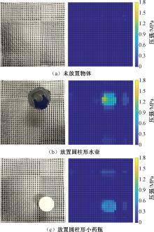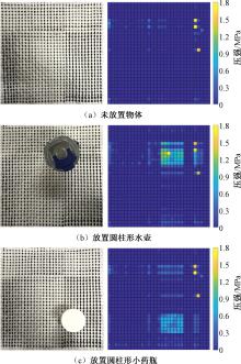 Pressure distribution detection results of fabric pressure sensor array system by placing different objects. (a) No object; (b) Cylindrical bottle; (c) Cylindrical medicine bottle"