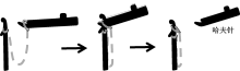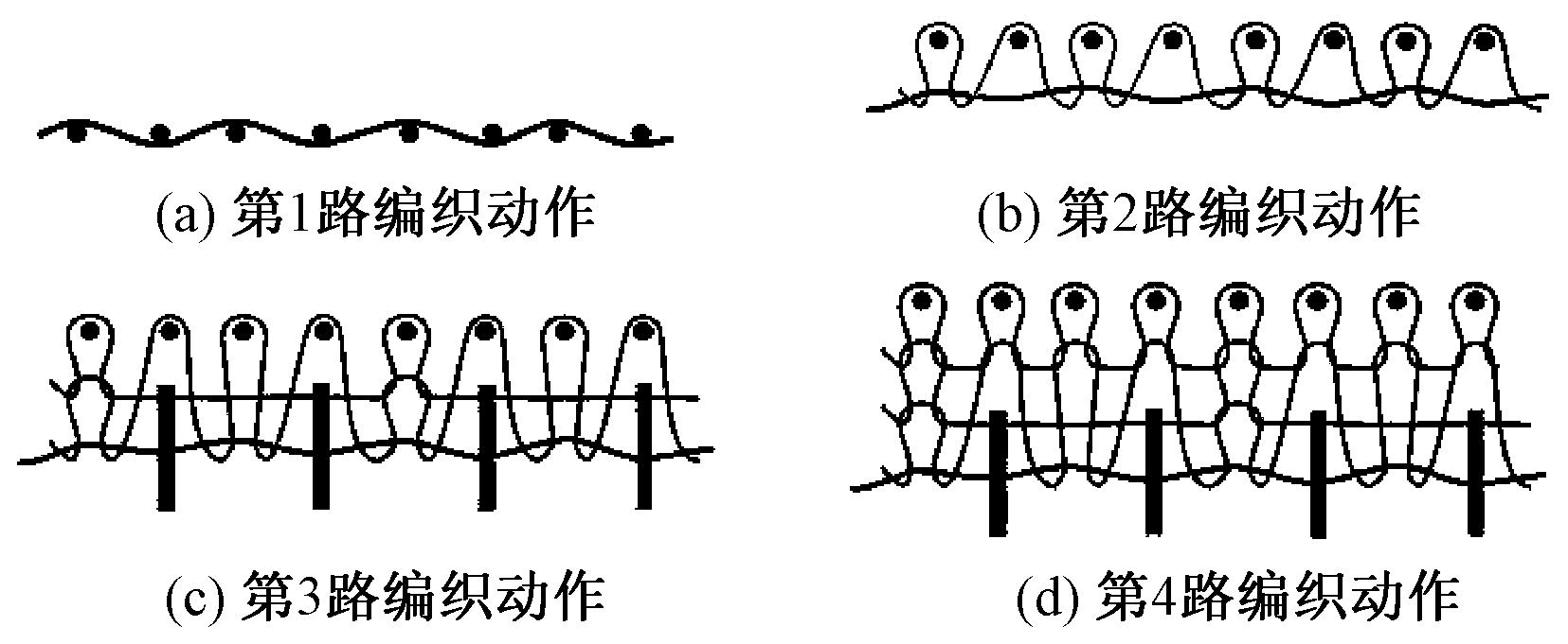 Opening process. (a) First knit action; (b) Second knit action; (c) Third way knit action; (d) Fourth way knit action"