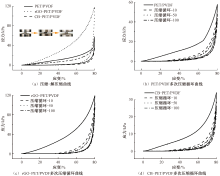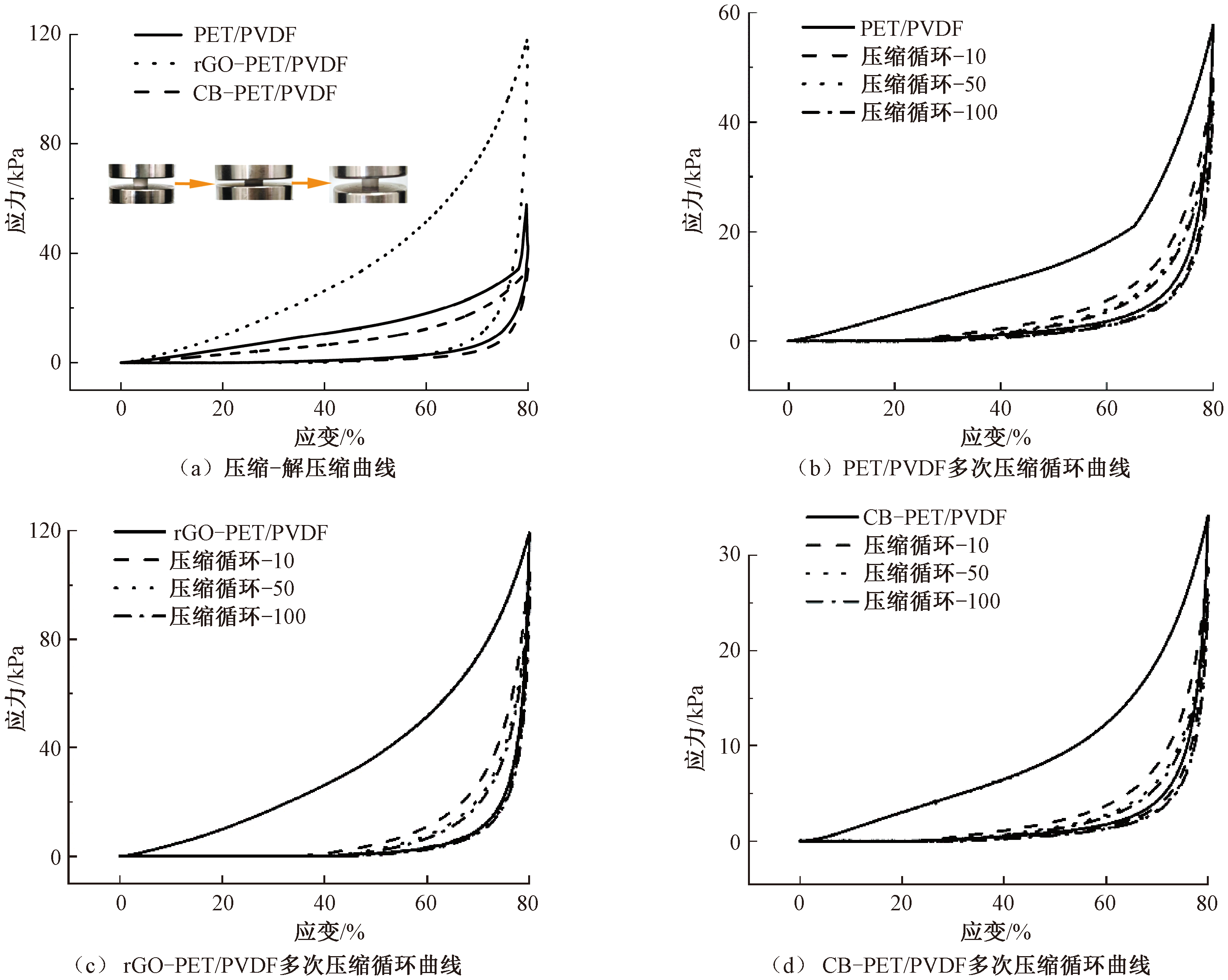 Mechanical property of composite fiber felts. (a) Compression-decompression curves; (b) PET/PVDF multiple compression cycle curves; (c) rGO-PET/PVDF multiple compression cycle curves;(b) CB-PET/PVDF multiple compression cycle curves"