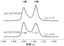 Roman spectra of GO-PET/PVDF and rGO-PET/PVDF composite fiber felts"