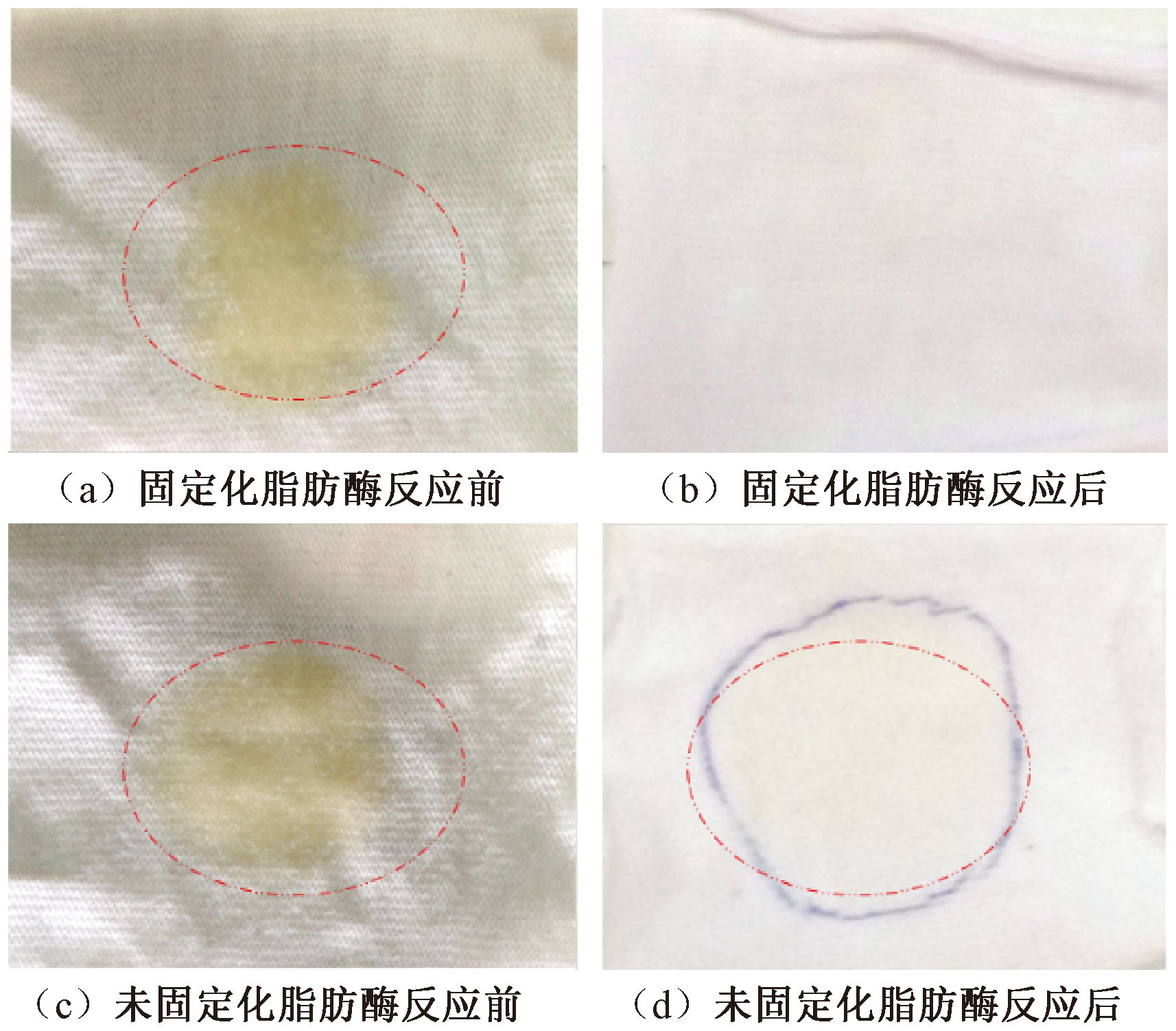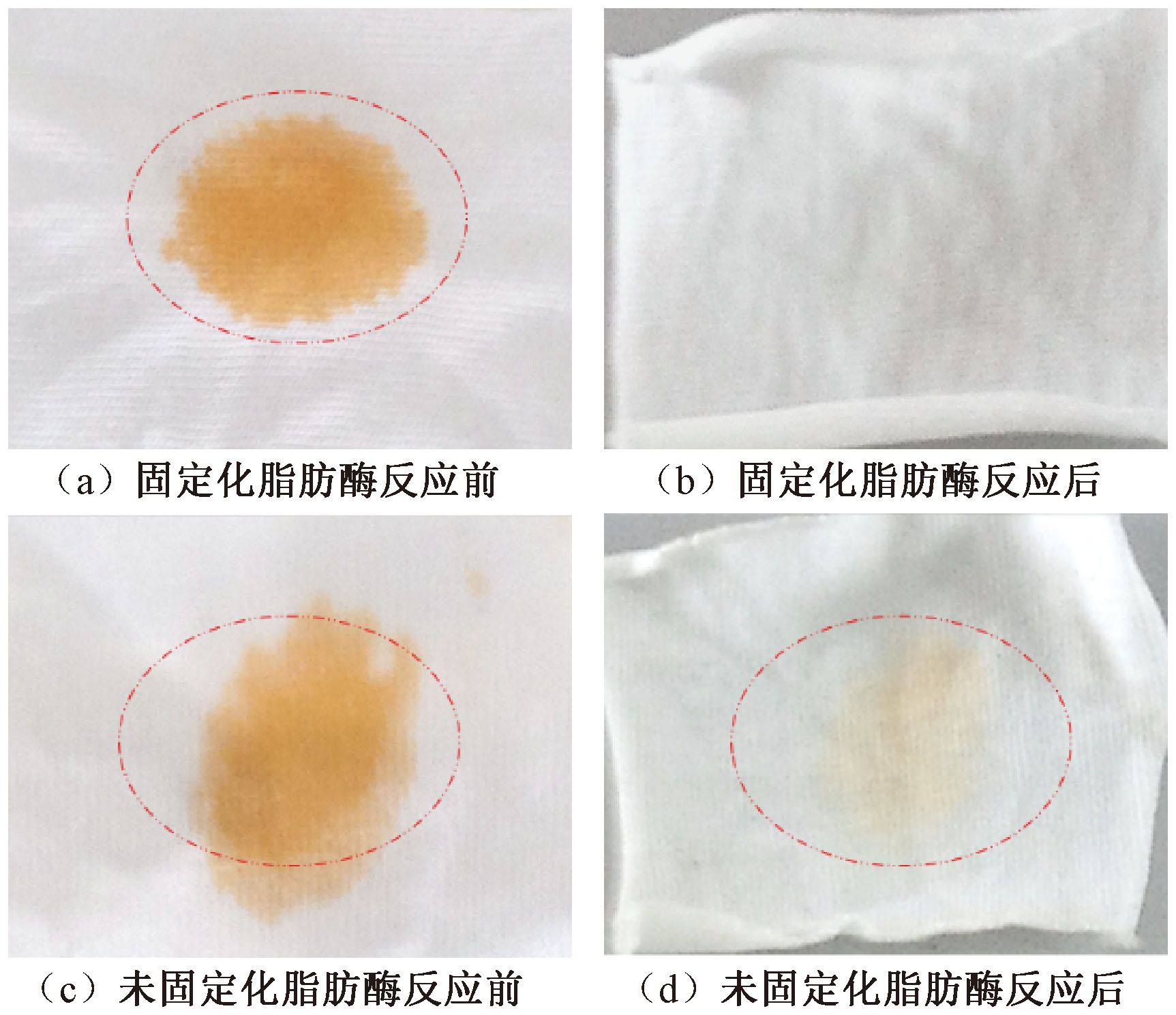 Degreasing effect of immobilized lipase on olive oil. (a) Before immobilized lipase reaction; (b) After immobilized lipase reaction; (c) Before unimmobilized lipase reaction; (d) After unimmobilized lipase reaction"