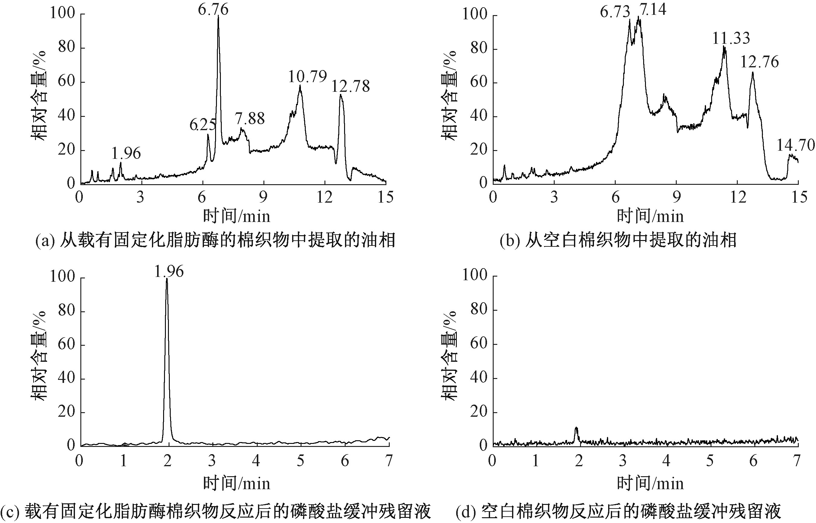 Liquid-mass analysis results of oil phase extracted from cotton fabric and buffer residue. (a) Oil phase extracted from immobilized lipase cotton fabric; (b) Oil phase extracted from blank cotton fabric; (c) Phosphate buffer residue after reaction of immobilized lipase in cotton fabric; (d) Phosphate buffer residue after reaction of blank cotton fabric"