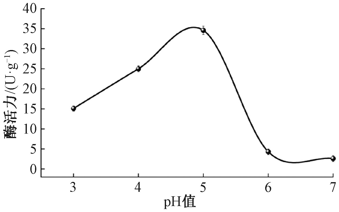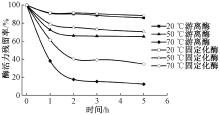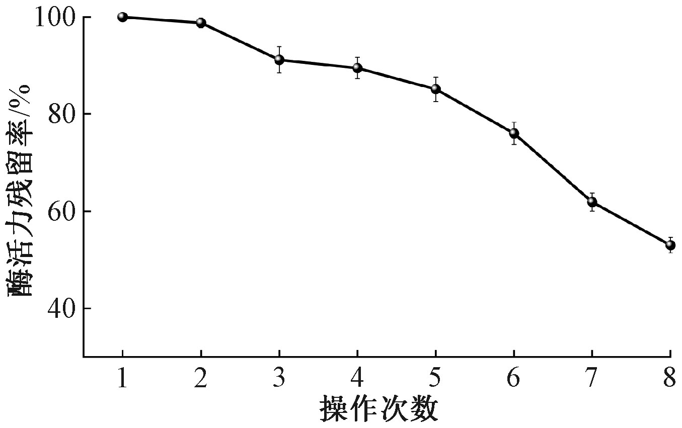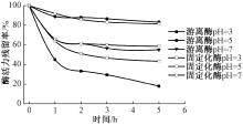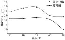 Conclusion The optimal pretreatment conditions for cotton fabric were found to be NaIO4 concentration of 0.20 mol/L and oxidation time of 2 h. The suitable conditions for lipase immobilization were identified to be lipase concentration of 15 g/L, reaction time of 12 h, pH value of 5.0, and reaction temperature of 4 ℃. The highest activity of the immobilized lipase was 35 U/g cotton fiber. Compared with the free lipase, the temperature stability and pH stability of the immobilized lipase were improved, and the lipase had better reusability and the cotton fabrics were endowed with good degreasing performance.