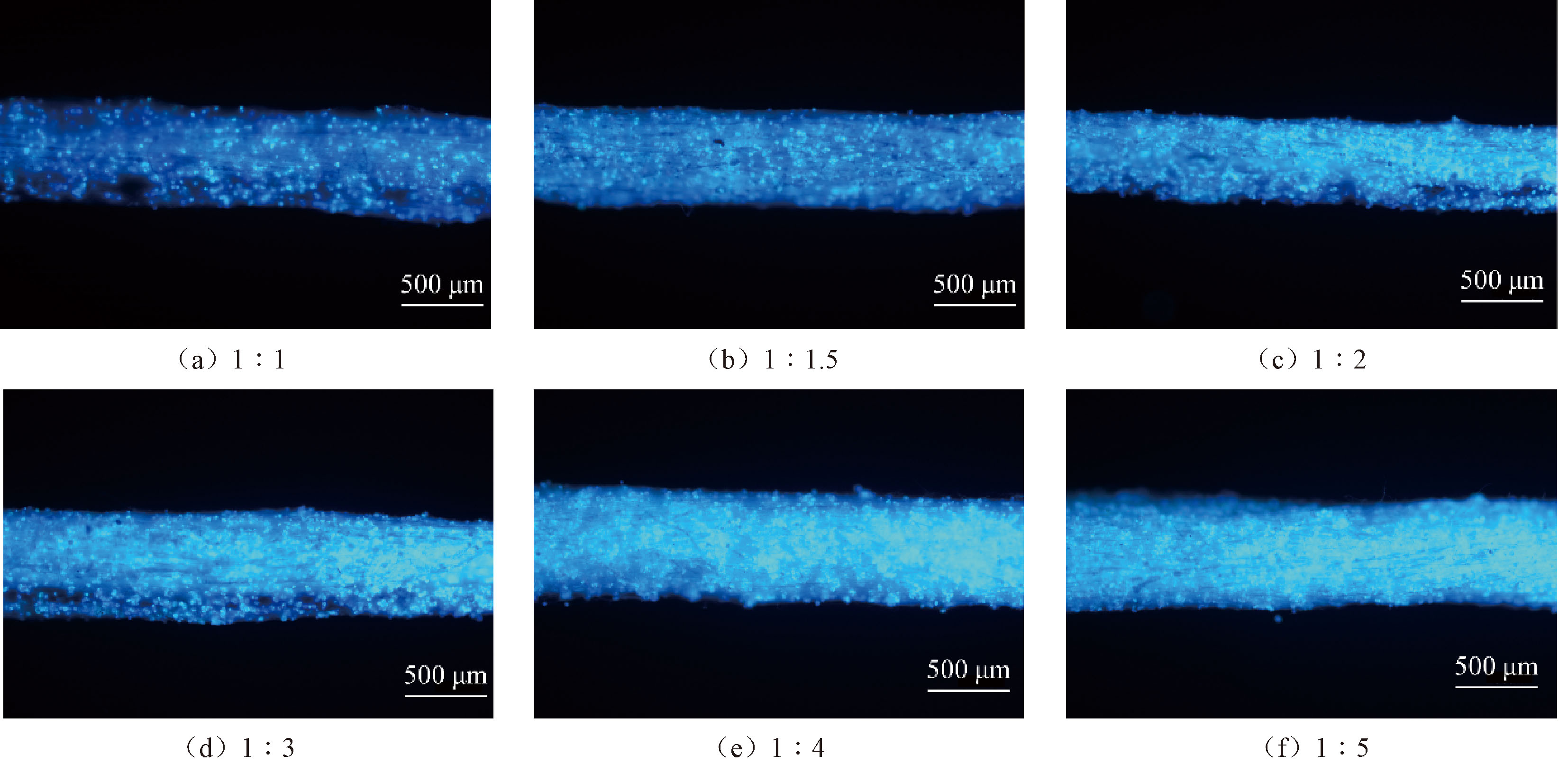 Fluorescence microscope images of PVDF/ZnS:Cu2+/silver-plated polyamide core-spnn yarns with different PVDF to ZnS:Cu2+ mass ratios"