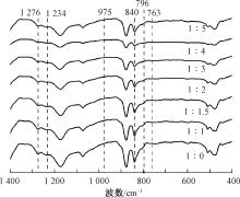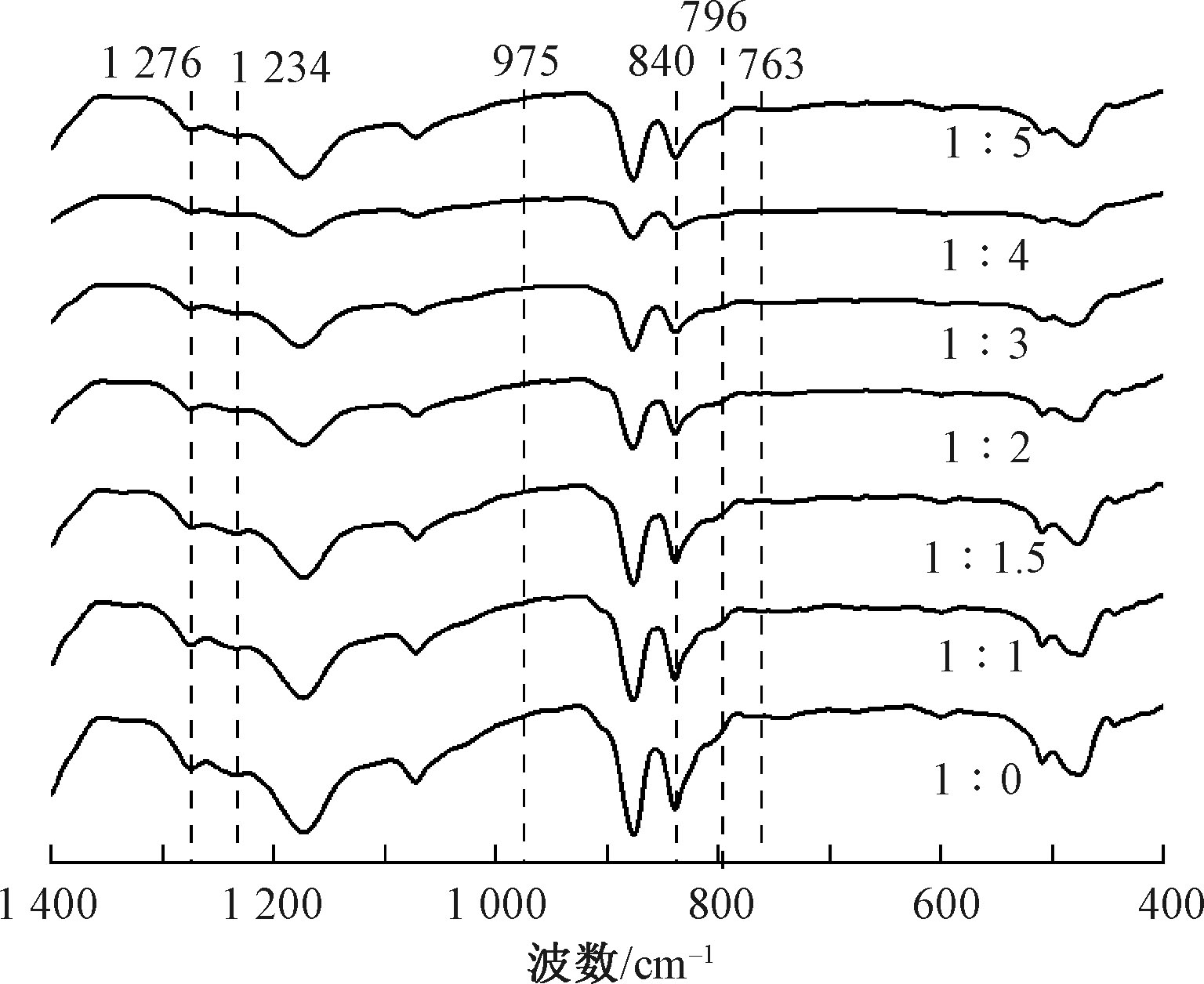 FT-IR spectra of PVDF/ZnS:Cu2+/silver-plated polyamide core-spun yarns with different PVDF to ZnS:Cu2+ mass ratios"