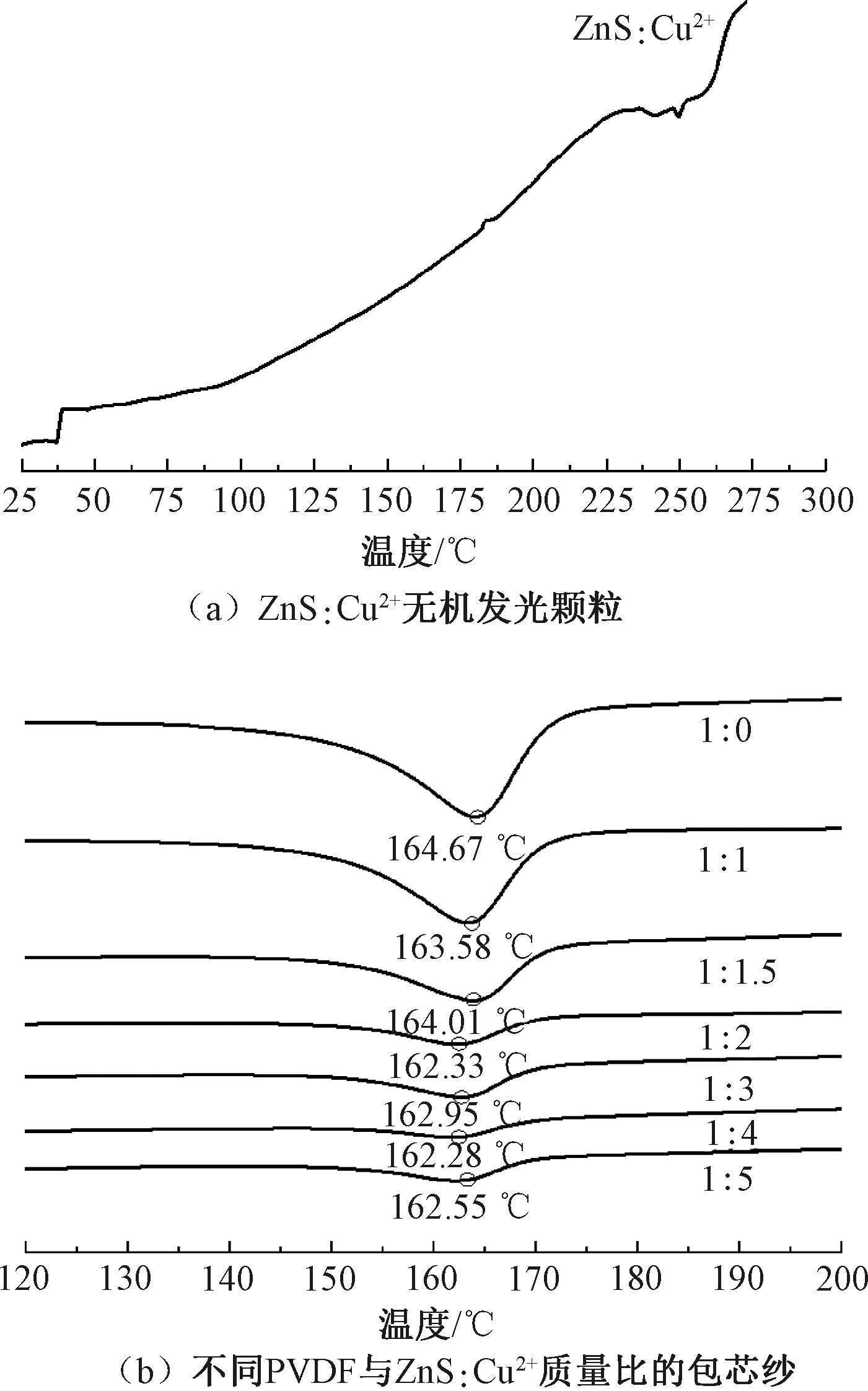 DSC curves of ZnS:Cu2+ particles (a) and PVDF/ZnS:Cu2+/silver-plated polyamide core-spun yarns with different PVDF to ZnS:Cu2+ mass ratios(b)"