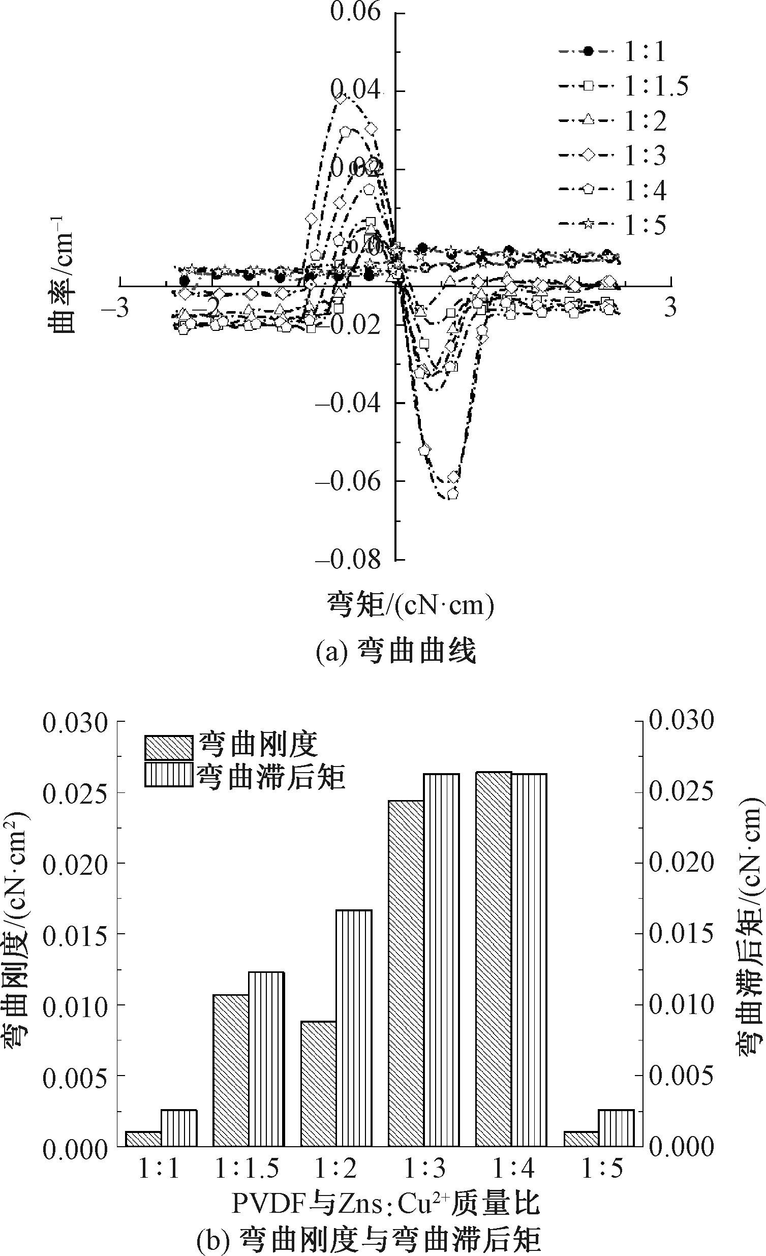 Rigidity and flexibility of PVDF/ZnS:Cu2+/silver-plated polyamide core-spun yarns with different PVDF to ZnS:Cu2+ mass ratios. (a) Bending curves;(b) Bending stiffness and bending hysteresis moment"
