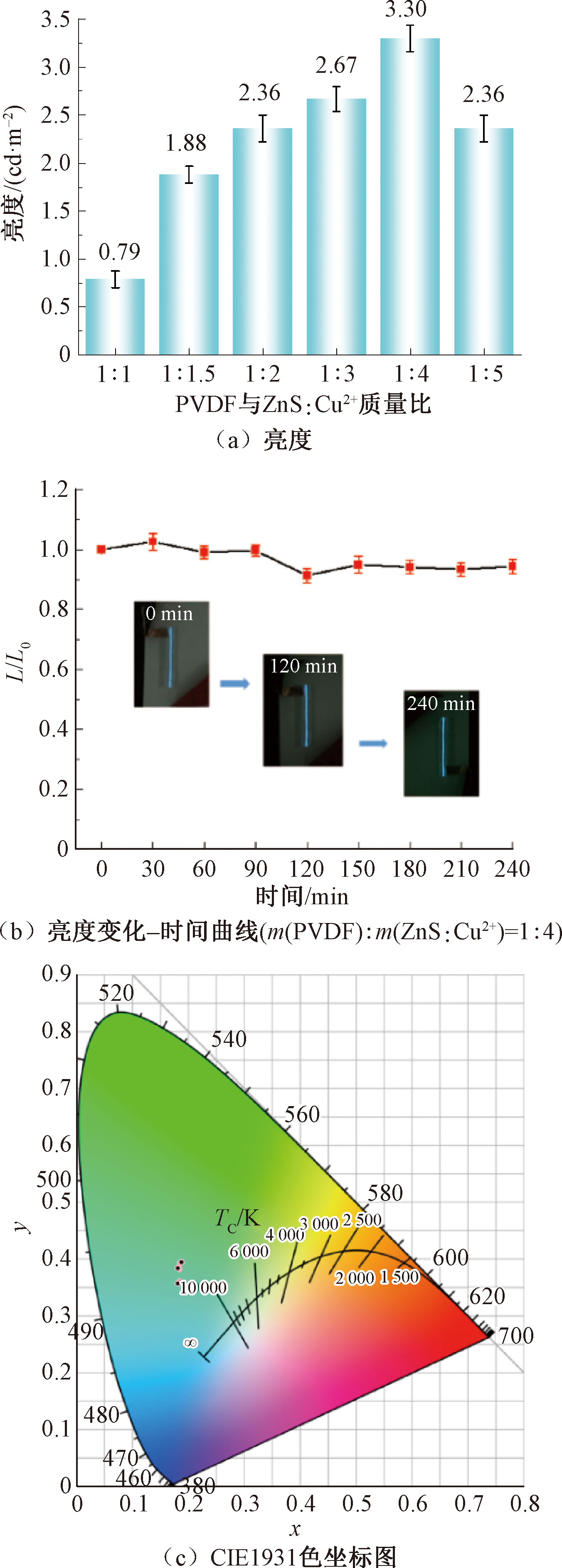 Luminescent performance of PVDF/ZnS:Cu2+/silver-plated polyamide core-spun yarns with different PVDF to ZnS:Cu2+ mass ratios. (a) Luminous intensity; (b) Time-luminance variation curve(m(PVDF):m(ZnS:Cu2+)=1:4); (c) CIE1931 color coordinates"