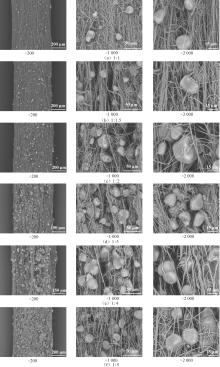 SEM images of PVDF/ZnS:Cu2+/silver-plated polyamide core-spun yarns with different PVDF to ZnS:Cu2+ mass ratios at different magnifications"