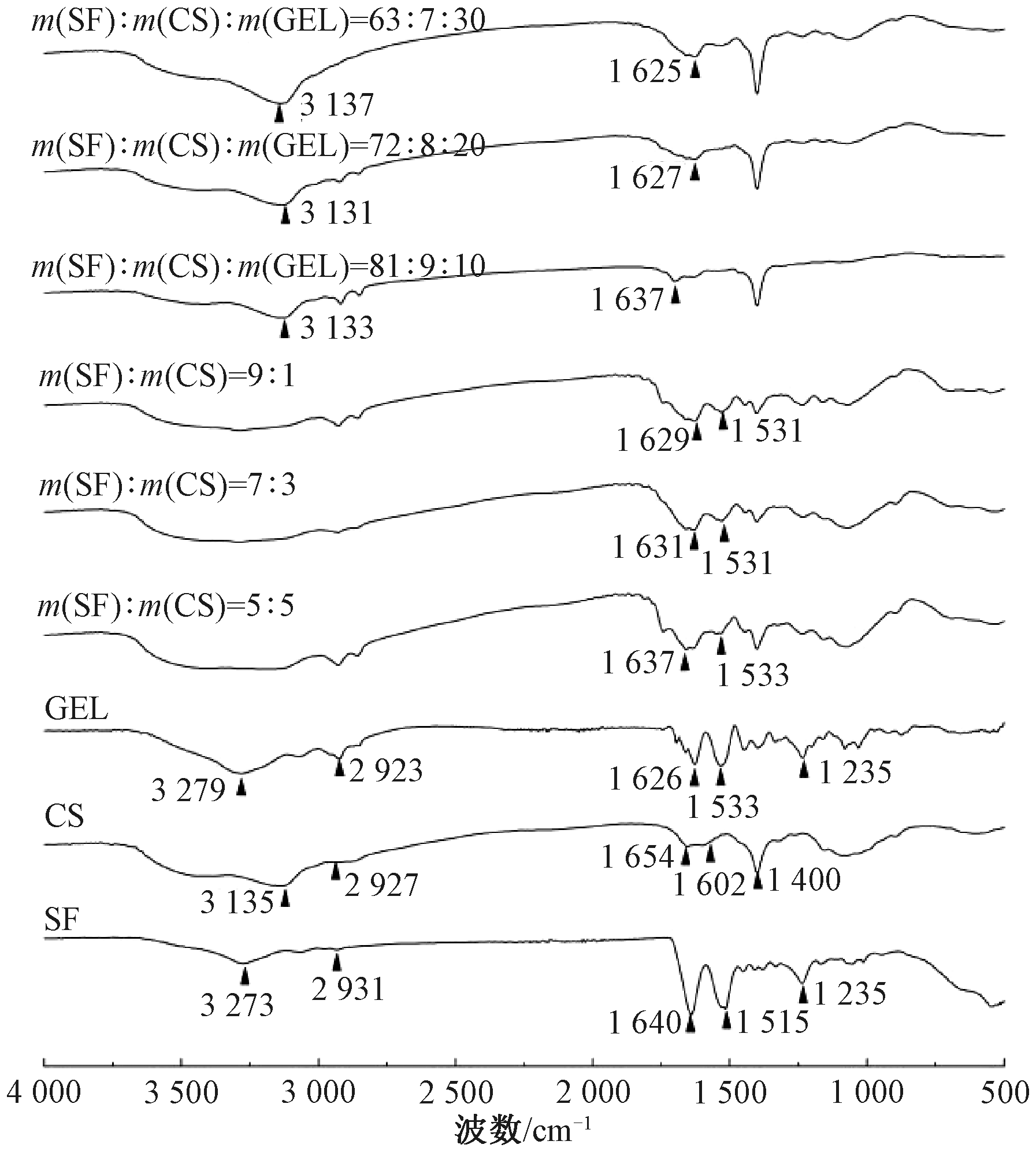 Infrared spectra of SF, CS, GEL and microspheres with different components"