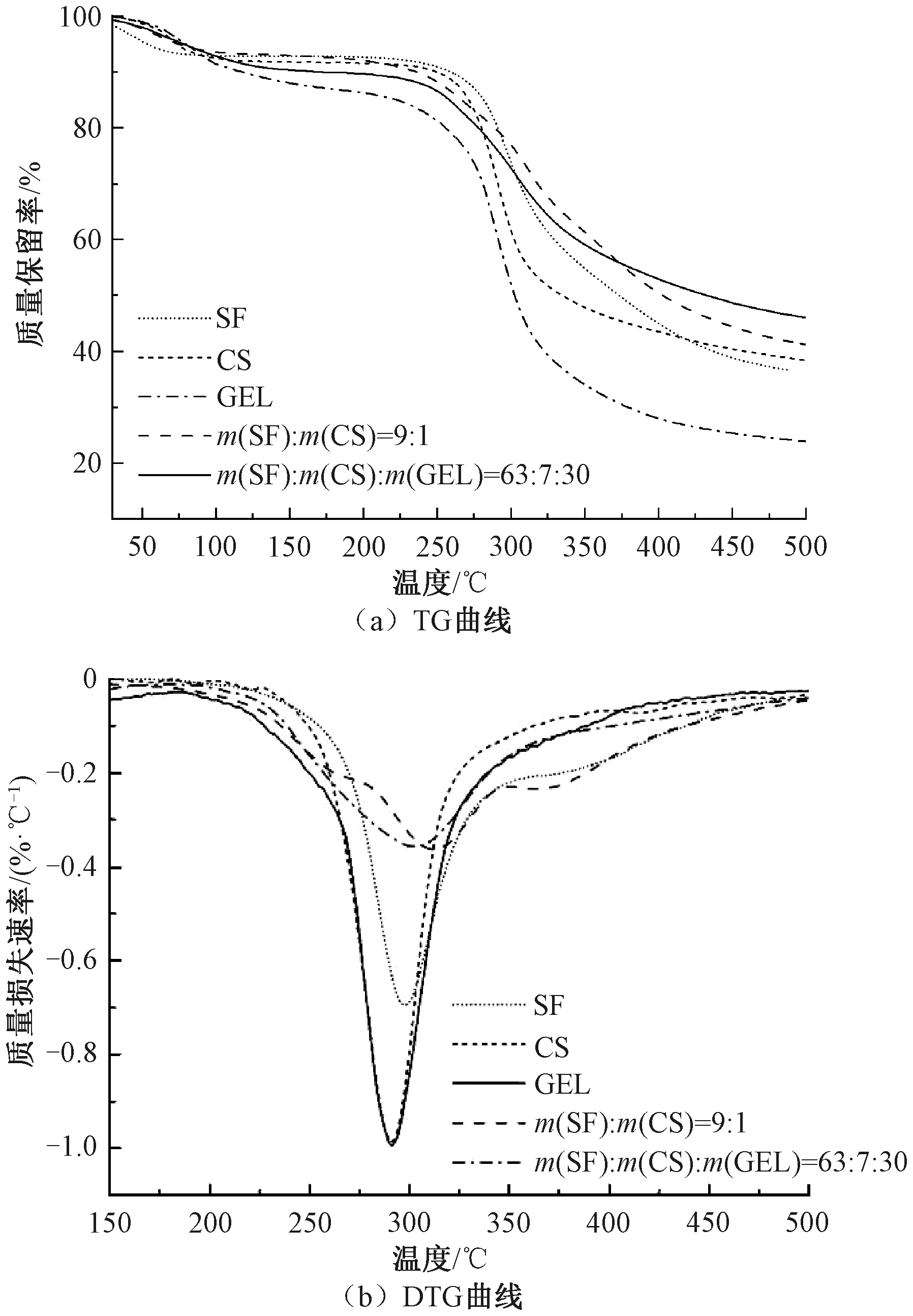 Thermogravimetric analysis of SF, CS, GEL, SF/CS and SF/CS/GEL microspheres. (a) TG curves; (b) DTG curves"