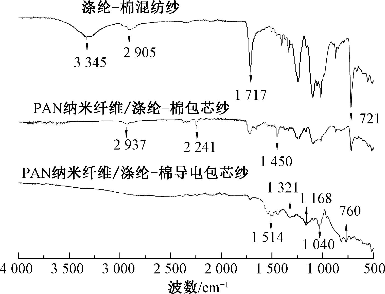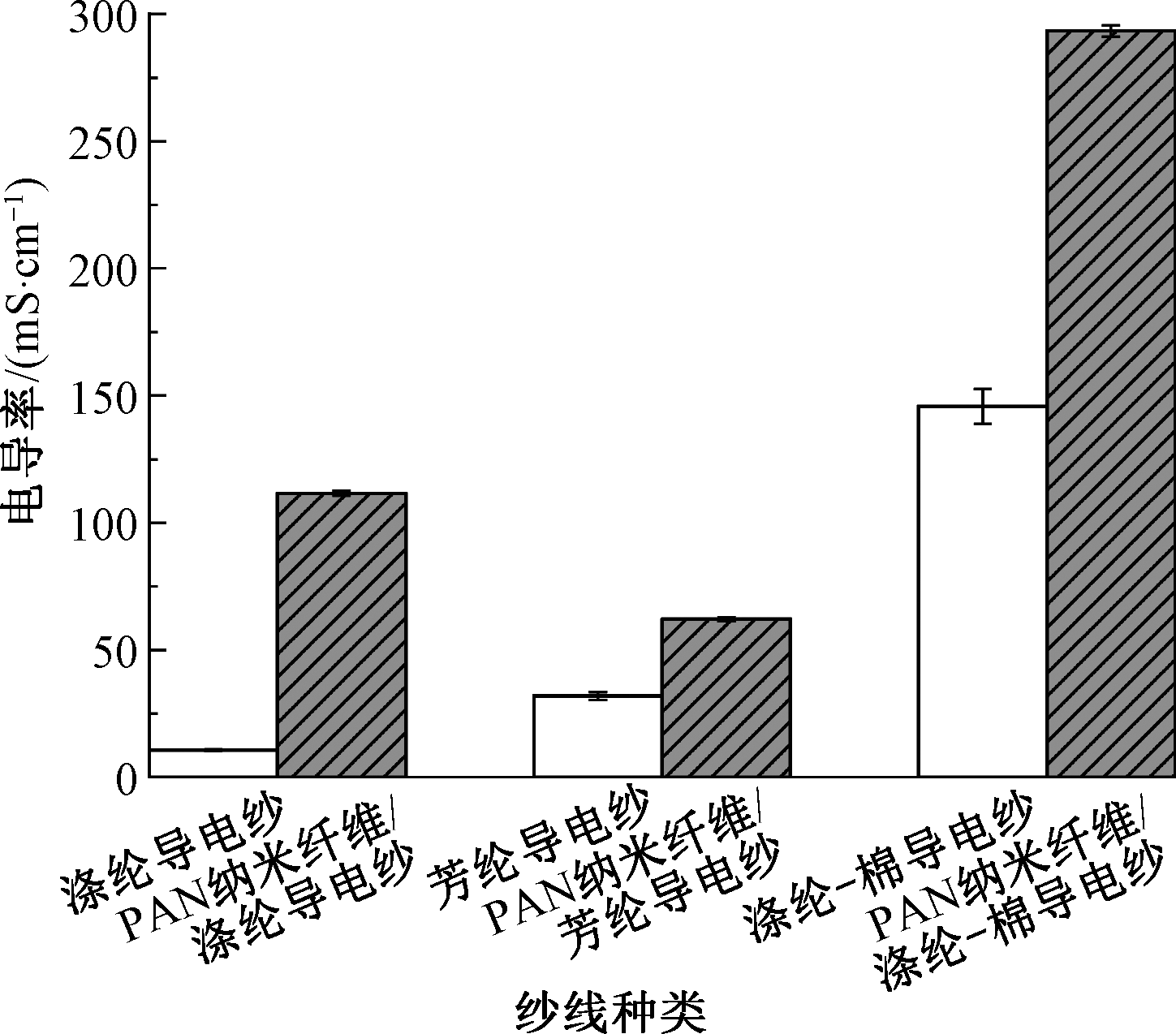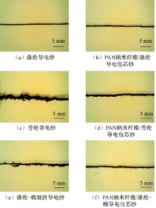 Method A homemade electrostatic spinning device was established for continuous preparation of nanofiber core-spun yarns. During the preparing process, three conventional yarns including polyester yarn, aramid yarn, and polyester-cotton blended yarn were selected as the core yarn, and polyacrylonitrile (PAN) nanofibers were enwrapped on the core yarn through electrospinning. As such, the nanofiber core-spun yarn possessed both high specific surface area of nanofibers and robust mechanical properties of conventional yarn. The conductive nanofiber core-spun yarn with surface supported polypyrrole (PPy) was successfully prepared by further in-situ polymerization of pyrrole. The morphologies, mechanical properties and electrical properties of PPy/PAN nanofiber core-spun yarns were analyzed and characterized. Finally, the PPy/PAN nanofiber core-spun yarns was wrapped on polyurethane yarns and then subjected to 2 000 cycles of stretch deformation at 10% strain to further study the long-term stability under repetitive strain cycles.
