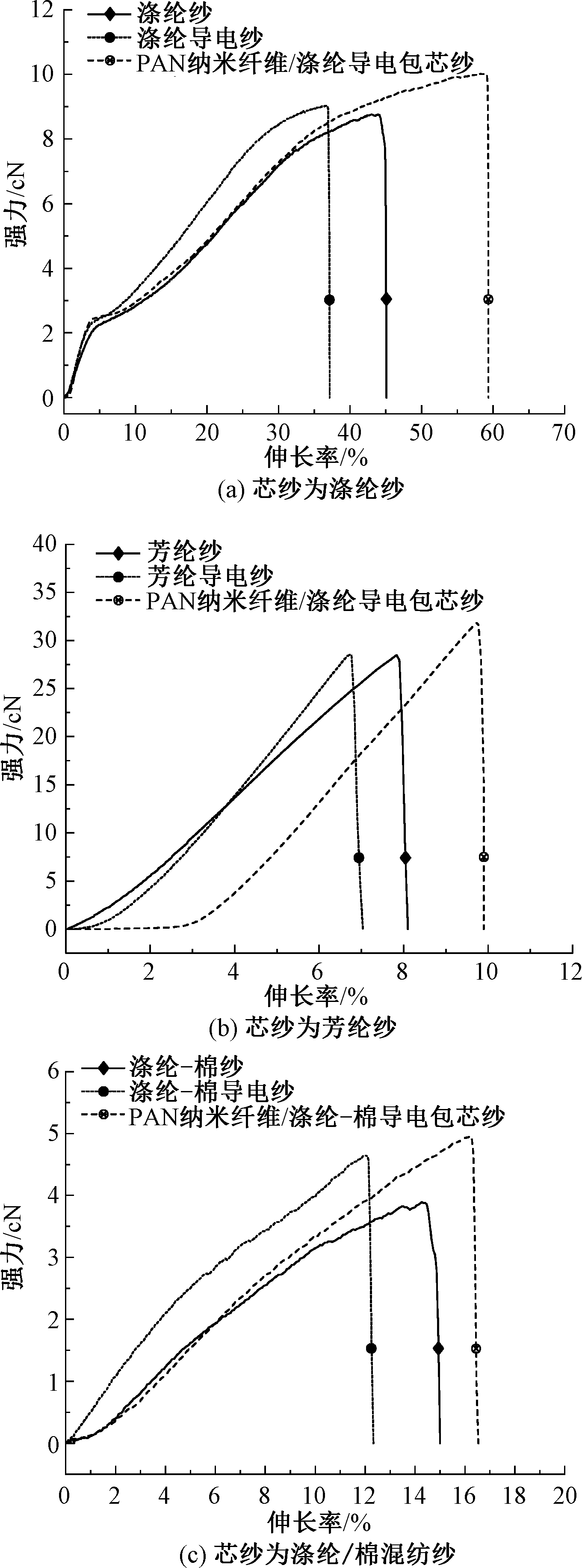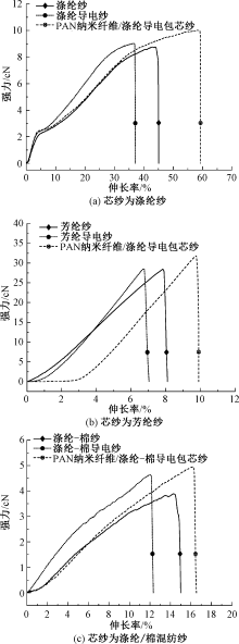 Mechanical properties of yarns. (a) Core polyester yarns; (b) Core aramid yarns; (c) Core polyester-cotton blended yarns"