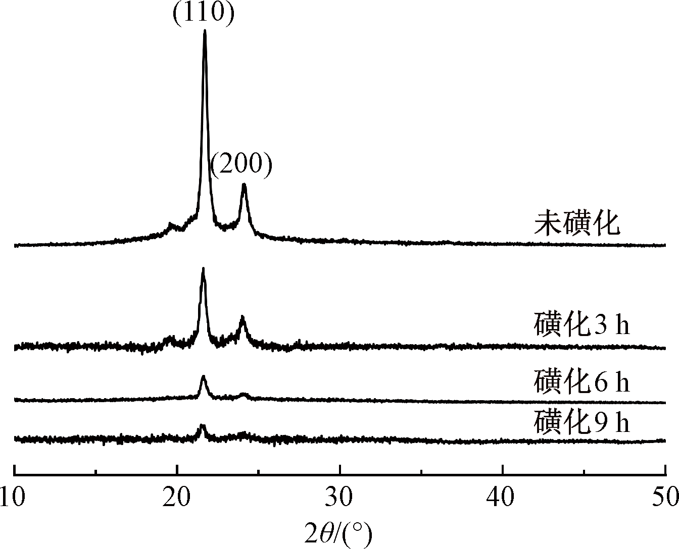 Results The study revealed that sulfonation time significantly impacted the structural integrity of the fabric. An optimal duration of 6 h was identified, while prolonged sulfonation (up to 9 h) progressively loosened the woven structure and caused fiber breakage. This was attributed to the incorporation of sulfonic acid groups and subsequent fiber swelling. SEM observations showed that fibers treated for 3 h exhibited hollow interiors due to insufficient crosslinking, whereas 6-h sulfonated samples maintained their structural integrity. The prolonged sulfonation for 9 h caused deformation of the fabric structure, indicating excessive cross-linking. EDS mapping confirmed sulfur enrichment within the fabric, validating the successful sulfonation process. XRD analysis revealed a gradual attenuation of the characteristic PE crystalline peak at 2θ=21.5°, indicating the dissociation of the crystal structure due to molecular chain irregularity and solvent penetration. The charring process demonstrated strong dependencies on sulfonation duration and temperature. The carbon yield at 900 ℃ increased from 17% for the 3-h sulfonated fabric to 38% for the 9-h sulfonated fabric. However, a higher charring temperature of 1 000 ℃ led to reduced mass retention, likely due to the collapse of the carbon skeleton. Charring temperature significantly influenced the electrical conductivity, with the 1 000 ℃ charred sample achieving 321.8 S/m, compared to 36.2 S/m at 800 ℃. The EMI shielding effectiveness in the X-band also increased with higher carbonization temperatures. A 1 mm-thick sample exhibited a shielding effectiveness of 34 dB, while a 3 mm-thick sample reached 87 dB, demonstrating the material's enhanced electromagnetic wave attenuation capability. The improvement was attributed to the improved graphitic microcrystallites of the carbon fibers and the formation of robust conductive networks maintained by the well-preserved textile structure. The charred fabric exhibited excellent EMI shielding performance, effectively reducing electromagnetic wave transmission, making it a promising candidate for lightweight and flexible EMI shielding applications.