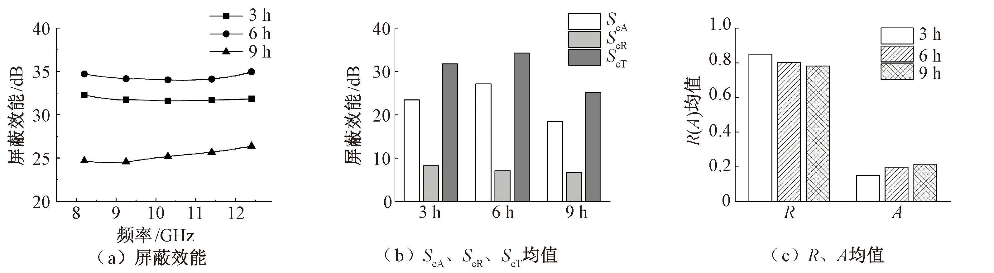 Electromagnetic shielding performance of samples with different sulfonation durations. (a) Se values; (b) SeA, SeR and SeT values; (c) R and A values"