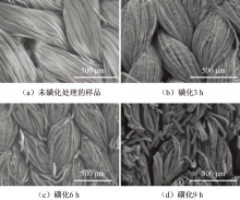 Morphologies of polyethylene fabrics after sulfonation. (a) Original sample; (b)Sulfonating for 3 h; (c) Sulfonating for 6 h; (d) Sulfonating for 9 h"