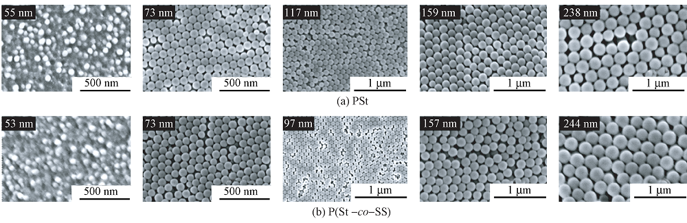 | Fig.2 FE-SEM images of PSt and P(St-co-SS) latex particles with different size |