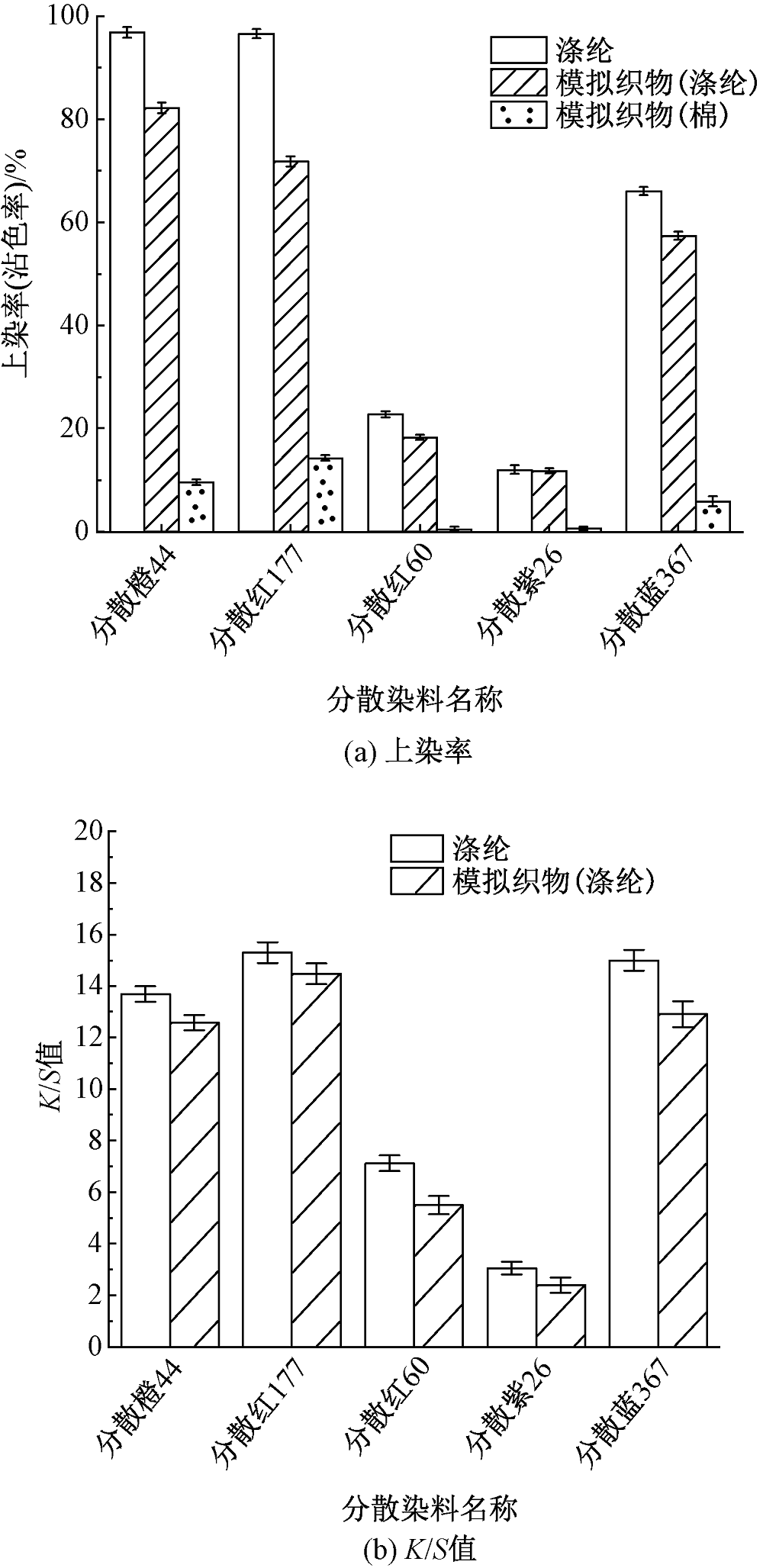 | Fig.2 Differences of fabric dyed with disperse dyes of different structures. (a) Uptake rate;(b) K/S value |