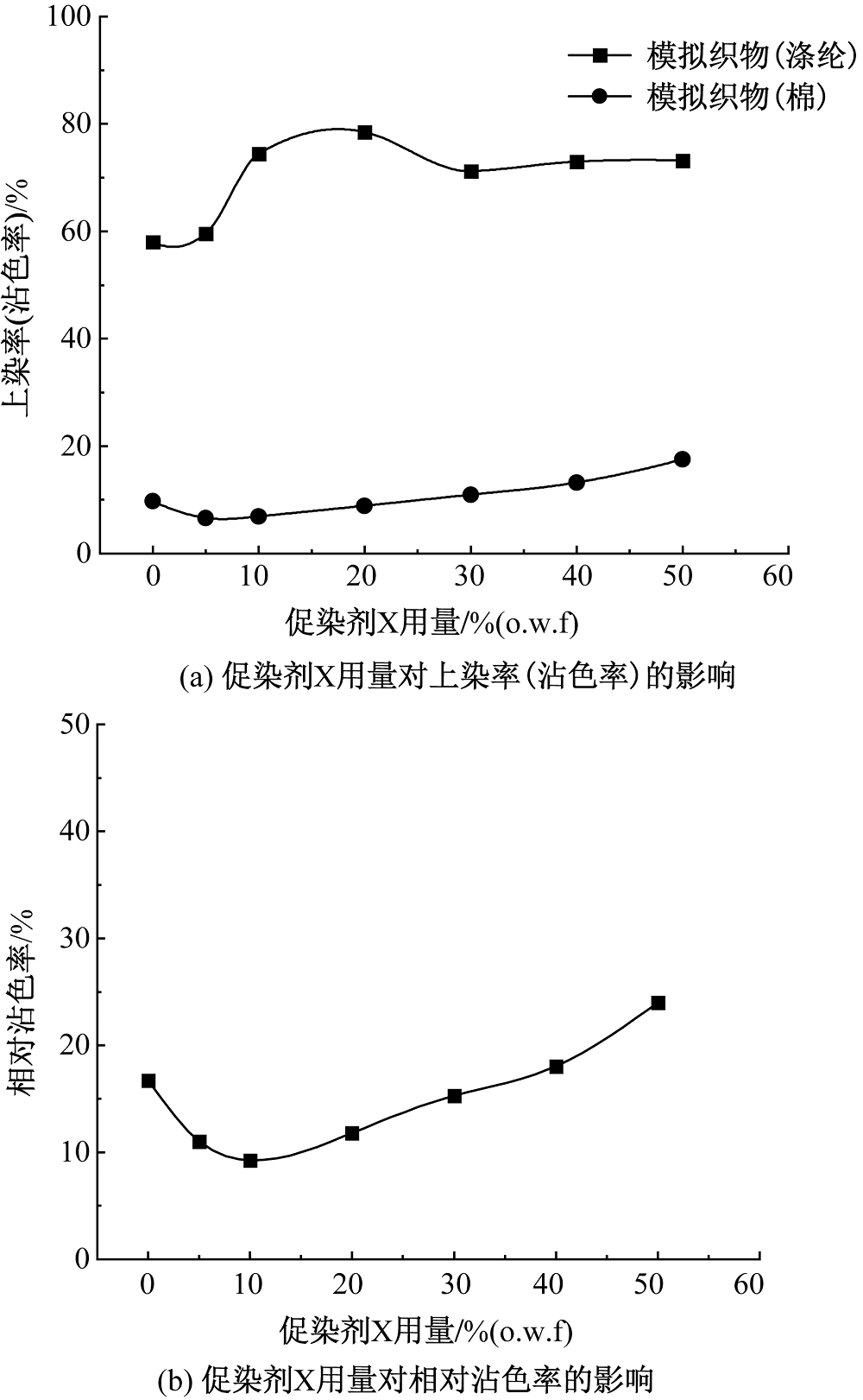 | Fig.5 Influence of accelerant X amount on dyeing performance of polyester/cotton simulated fabrics at 140 ℃. (a) Influence of accelerant X amount on dyeing uptake/staining rate;(b) Influence of accelerant X amount on relative staining rate |