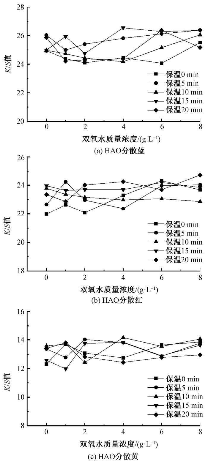 由图5可以看出,HAO分散蓝、红和黄3只染料上染的涤盖棉织物涤组分的K/S值仅在某个值附近波动,可认为涤组分的色光几乎保持稳定。此外,分别使用HAO分散蓝、红和黄3只染料对涤盖棉织物进行常规工艺处理,得到涤组分的K/S值分别为25.36、23.65和13.41,与漂染一浴工艺处理后的涤组分K/S值几乎一致,ΔECMC均在1.0以下,因此可认为,在漂染一浴加工体系中,双氧水和其他漂白助剂的存在并未影响HAO分散蓝、红、黄3只染料的染色效果,且双氧水质量浓度及在100 ℃下的保温时间对这3只染料上染涤纶的K/S值没有影响。