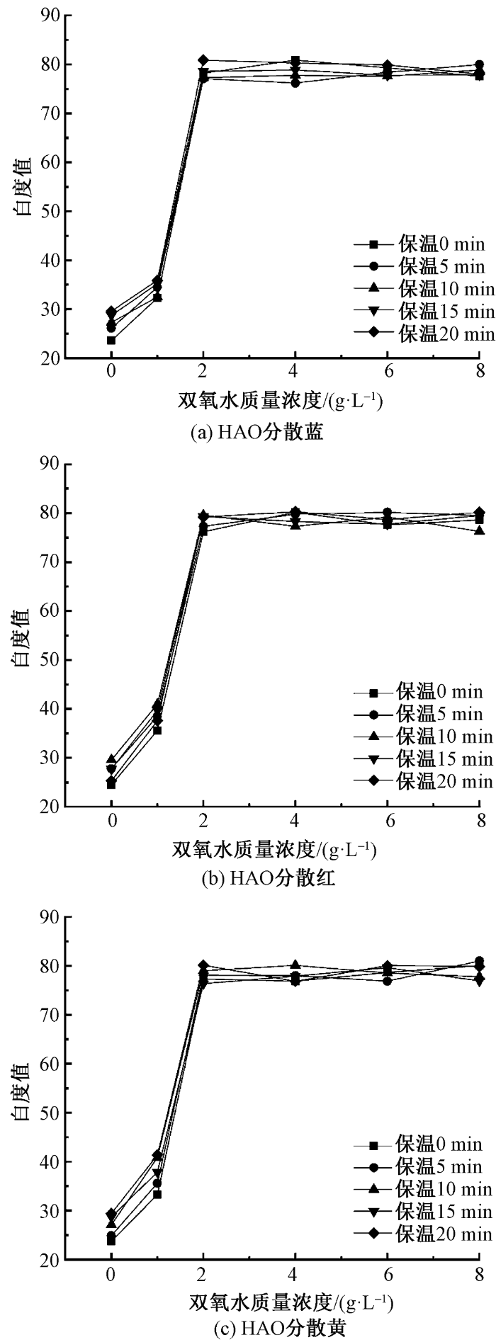 由图6可以看出,在漂染一浴加工体系中,HAO分散染料及其它染色助剂的存在并未影响双氧水的漂白作用。双氧水质量浓度为2 g/L,保温时间为0 min时,涤盖棉织物棉组分的白度值就可达到工业及生活用品的加工要求,与传统工艺所得白度几乎无差别。再增加双氧水的用量,棉组分的白度值也几乎没有增加,因此最优的双氧水质量浓度是2 g/L,在100 ℃下的最佳保温时间是0 min。传统工艺常用质量浓度为4 g/L的双氧水对棉织物进行漂白,从室温升温至100 ℃后保温35 min,一般能使棉织物的白度值达到80左右[20]。漂染一浴工艺与传统漂白工艺处方存在差别的主要原因是,漂染一浴工艺会将温度逐步升至130 ℃,延长了双氧水的作用温度和时间,从而可减少双氧水的用量,漂白工艺中双氧水用量的降低可使后续除氧的难度大大降低。