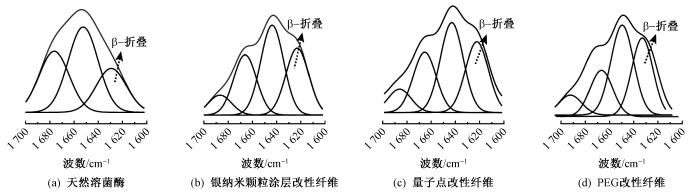图1为天然溶菌酶和3种功能化改性纤维表面的酰胺Ⅰ带红外光谱分峰图。可以看出,与天然溶菌酶相比,3种功能化改性纤维表面的β-折叠峰面积(约在1 620 cm-1处)明显增加,即β-折叠结构的含量显著增加。