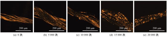 使用万能材料试验机固定改性纤维进行循环弯折测试,评估弯折次数对纤维荧光性能的影响,结果如图10所示。可以看出:随着弯折次数的增加,纤维表面的荧光强度几乎保持不变,但是量子点的分布逐渐变得不连续;10 000次循环以内量子点改性涂层能够稳定黏附在纤维表面,超过10 000次后涂层稳定性降低,荧光变得不连续。