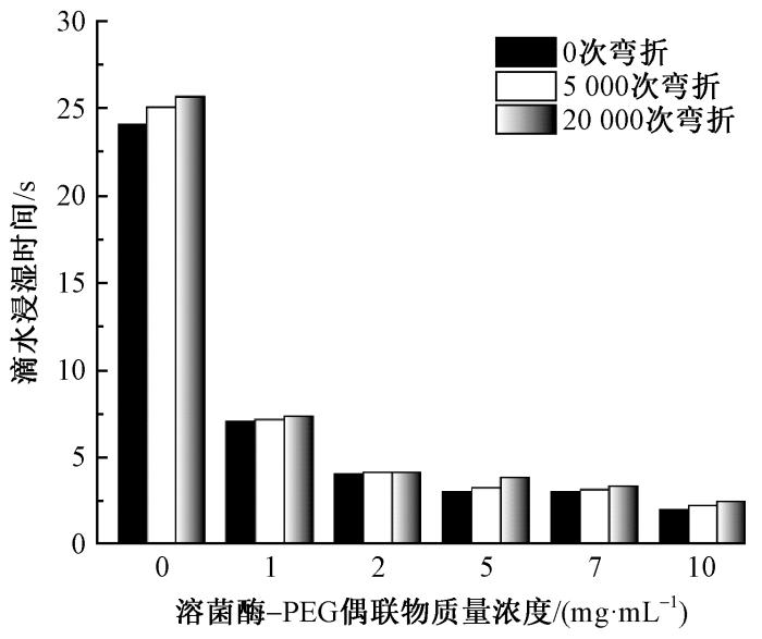图12示出不同质量浓度溶菌酶-PEG偶联物制备的改性织物的滴水浸湿时间。可以看出,随着溶菌酶-PEG偶联物质量浓度的增加,改性织物的浸湿速度变快,相较于未改性织物,改性织物的滴水浸湿时间从24 s缩短至2.5 s。同时对改性织物弯折前后的滴水浸湿时间进行对比发现,经过5 000次和20 000次弯折后,改性织物的滴水浸湿时间变化较小,说明改性涂层具有良好的稳定性。