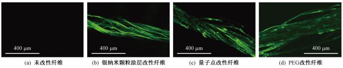 在黑暗条件下,将银纳米颗粒涂层改性纤维、量子点改性纤维、PEG改性纤维3种功能纤维完全浸泡在ThT溶液(1 mg/mL)中染色15 min,再用超纯水浸泡(漂洗)10 h。然后用激光共聚焦显微镜拍摄荧光照片,观察是否有绿色荧光。设置激发波长为458 nm。