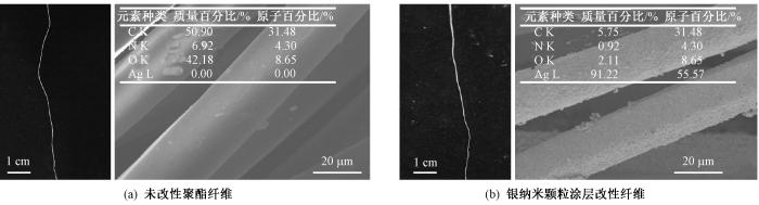 未改性聚酯纤维和银纳米颗粒涂层改性纤维的光学照片、扫描电镜照片以及能谱分析数据