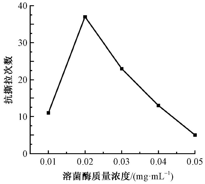 利用胶带撕拉和弯折实验表征了功能涂层在纤维表面的黏附稳定性,结果如图4所示。可以看出,涂层抵抗胶带撕拉次数与溶菌酶质量浓度有关。溶菌酶质量浓度为0.01、0.02、0.03、0.04、0.05 mg/mL时,涂层分别可抵抗11、37、23、13、5次3M胶带撕拉。