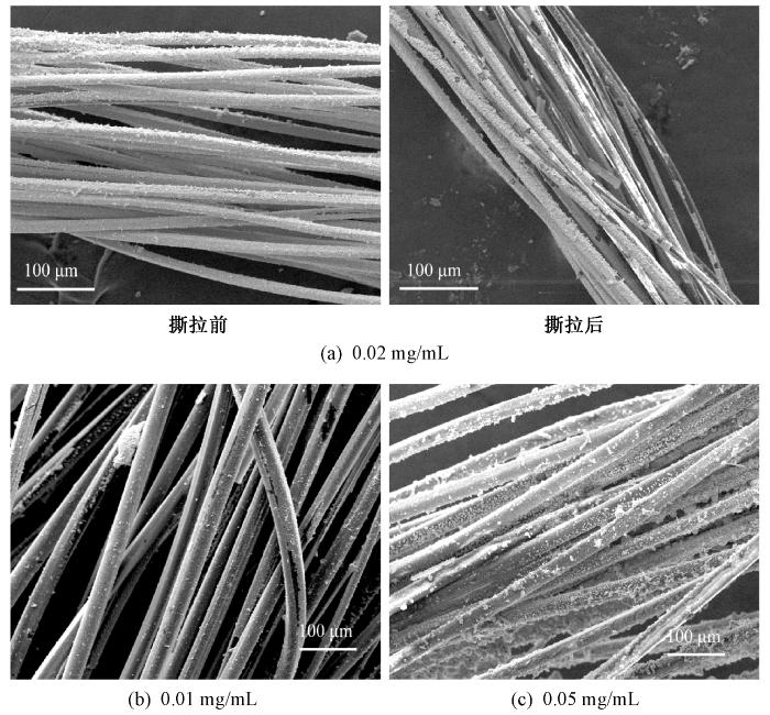 溶菌酶质量浓度为0.02、0.01和0.05 mg/mL时制备的银纳米颗粒涂层改性纤维的扫描电镜照片