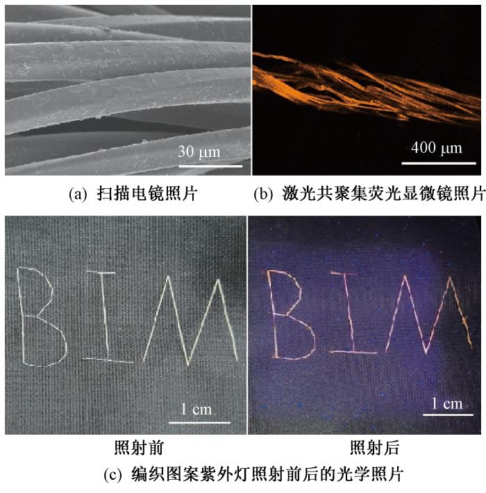 量子点改性纤维的扫描电镜照片、激光共聚焦荧光显微镜照片和编织图案紫外灯照射前后的光学照片