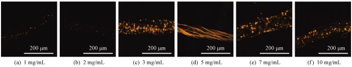 图9示出不同质量浓度溶菌酶溶液制备的改性纤维激光共聚焦荧光显微镜照片。可以看到,随着溶菌酶质量浓度的增加,纤维表面荧光呈现先增强后减弱的变化趋势,其中溶菌酶质量浓度为5 mg/mL时,所制备的改性纤维表面荧光强度最高且最连续。这是由于当溶菌酶质量浓度较低时,生成的蛋白质涂层较薄且包裹的量子点数量较少,所以纤维表面荧光强度低且不连续;而当溶菌酶质量浓度过高时,部分量子点会被蛋白质类淀粉样聚集产物包裹并沉积至反应容器底部而未成功附着于纤维表面,导致荧光强度降低。