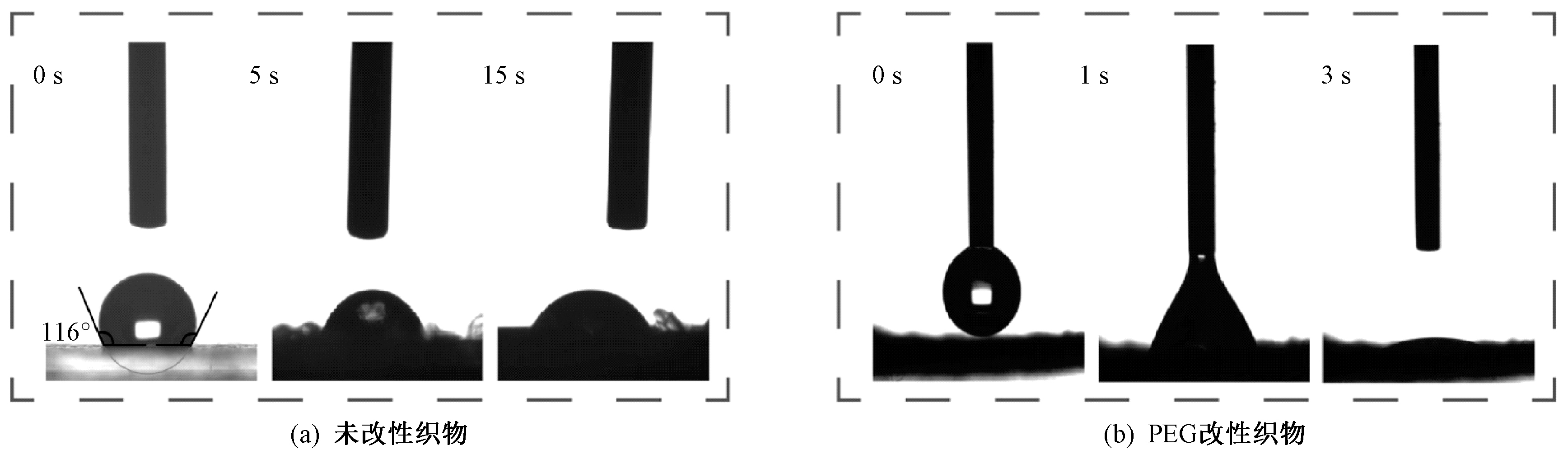 | 图11 未改性织物和PEG改性织物表面水滴浸湿过程中不同时间点的接触角照片 |