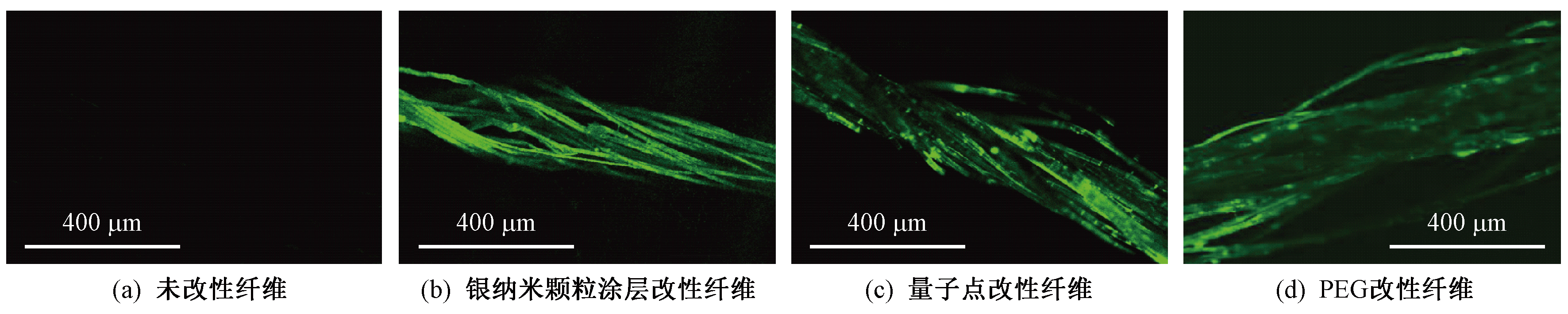 | 图2 未改性纤维、银纳米颗粒涂层改性纤维、量子点改性纤维、PEG改性纤维的ThT染色激光共聚焦荧光显微镜照片 |