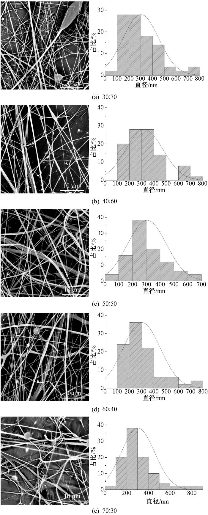按照体积比为30∶70、40∶60、50∶50、60∶40、70∶30的SA溶液(质量分数为2.0%)和PEO溶液(质量分数为8.0%)配制成纺丝液,在纺丝电压为25 kV、纺丝距离为15 cm的条件下进行纺丝。观察不同比例的SA/PEO纳米纤维的表观形貌和纤维直径分布,结果如图2所示。可以看出:当SA与PEO体积比为30∶70时,纺丝过程相对不稳定,纤维出现了明显的珠串现象,且纤维直径分布不均;随着PEO比例逐渐降低,纤维中的珠串现象得到改善,当体积为50∶50时,纤维表面变得更加光滑,且纤维直径的均匀性明显提高,直方图中纤维直径的分布更为集中,表明此时的溶液配比更有利于形成质量更高的纳米纤维;当SA的比例超过50%,PEO含量降低时,纤维的产出量有所下降,纤维开始出现相互粘连的现象,直径分布也变得更加不均匀。这可能是由于SA含量的增加导致溶液的黏性增大,使得纤维较难被拉伸成细丝,从而影响了纤维的形成和质量。