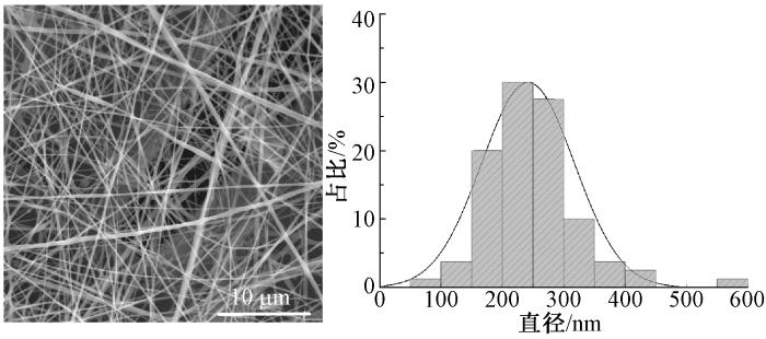 在纺丝电压为25 kV、纺丝距离为15 cm的条件下,选择最佳配比(SA与PEO质量比为1∶4,SA/PEO总质量分数为4%,PVP质量分数为10%)制备SA/PEO/PVP纳米纤维,其形貌图及直径分布直方图见图4。观察可知,纺丝量有了明显提升,纤维表面光滑,串珠或珠粒的形成减少,成形状态良好。纤维直径分布图结果表明,将SA、PEO和PVP按比例混合制备的纤维直径分布较集中,平均直径为240 nm,95%的纤维直径分布在100~400 nm区间,其中在200~300 nm区间的纤维占57.5%。