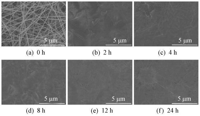 为增强SA/PEO/PVP纳米纤维膜的耐水性,选用CaCl2无水乙醇溶液对其进行交联改性处理,并观察了不同交联时间下纤维形貌的变化,如果如图5所示。