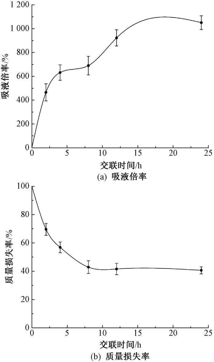 不同交联时间的复合纳米纤维膜在PBS溶液中处理24 h后的吸液倍率和质量损失率