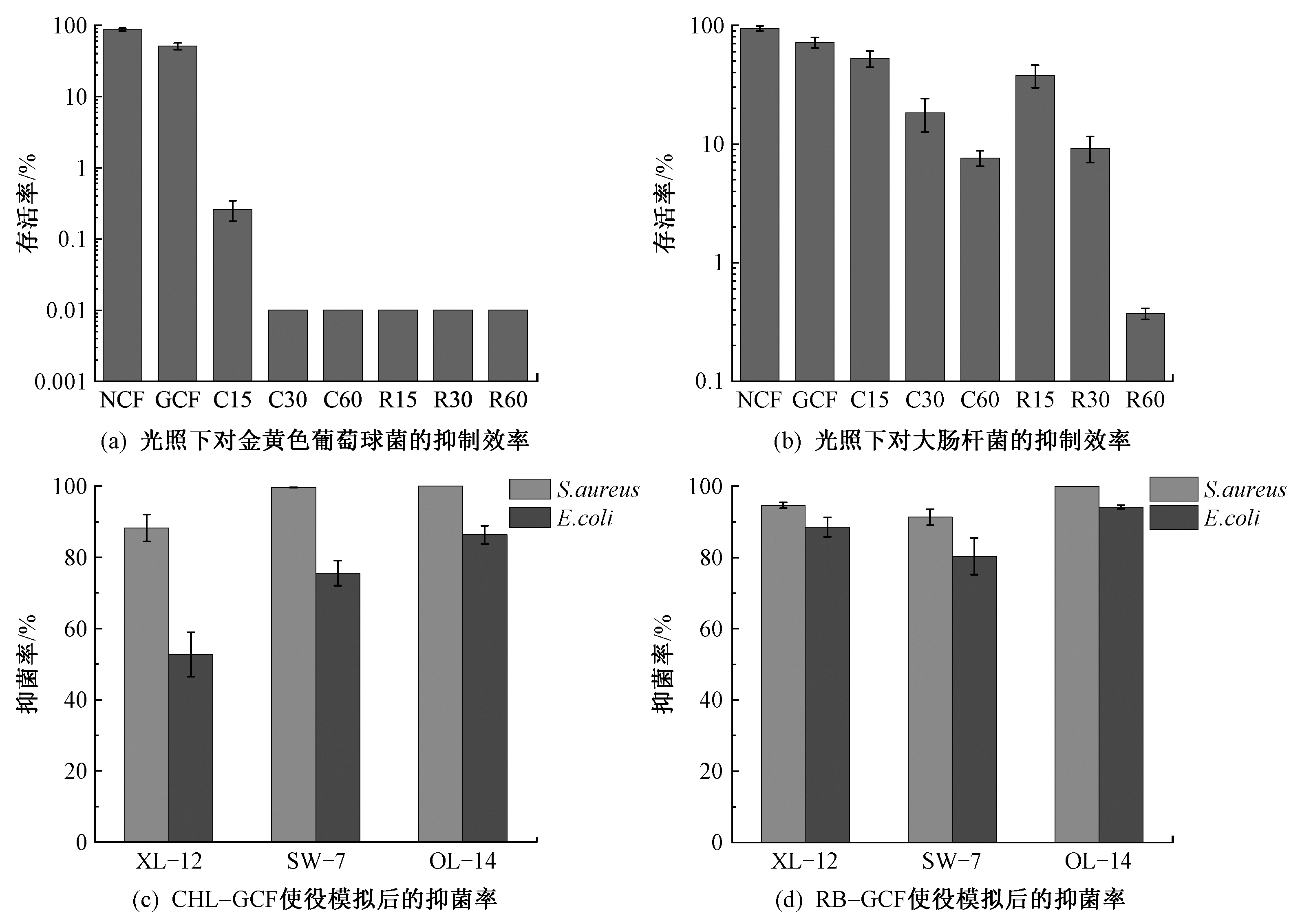 | Fig.6 Antimicrobial and durability properties of photodynamic spunlaced cotton. (a) Killing rate of S. aureus under light; (b) Killing rate of E. coli under light; (c) Inhibition rate of CHL-GCF after service; (d) Inhibition rate of RB-GCF after service |