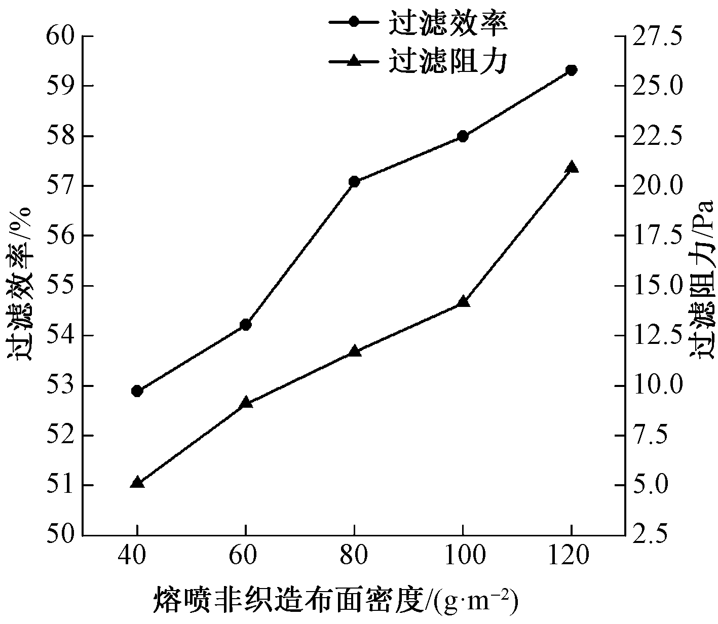 | 图8 不同面密度熔喷非织造布的过滤效率与过滤阻力 |